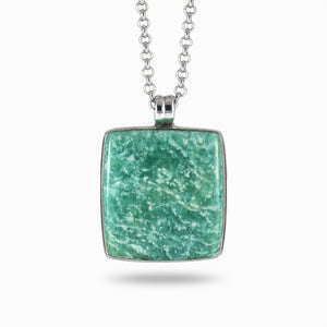 This amazing Russian Amazonite square cabochon necklace displays distinct shades of Verdigris green, with a contrasting white pattern. This Amazonite crystal necklace can help to suppress any fears or worries while it dispels negative energy. This Amazonite necklace can also help soothe the soul and calm the mind. While wearing this necklace you can look beautiful and have general well-being.
