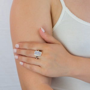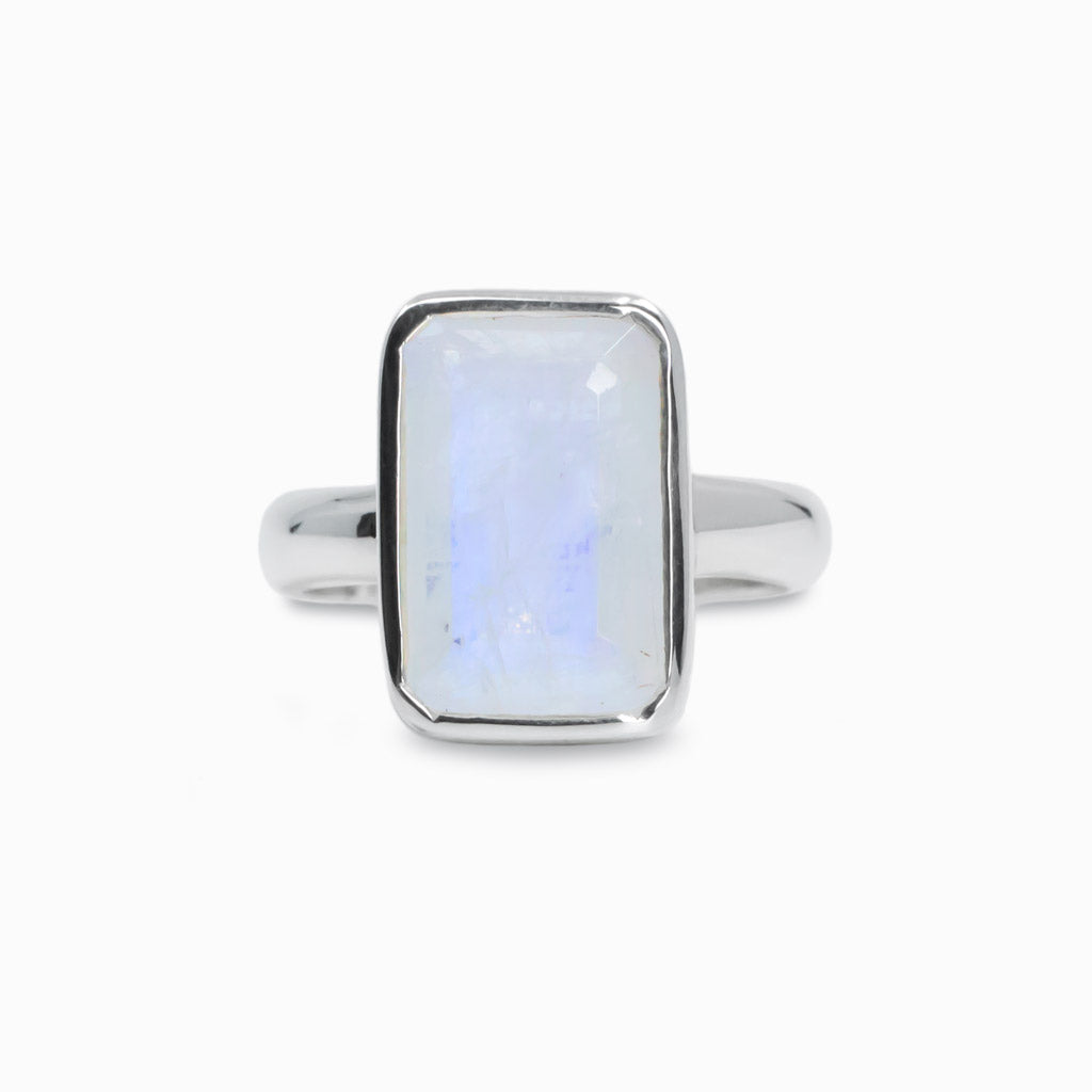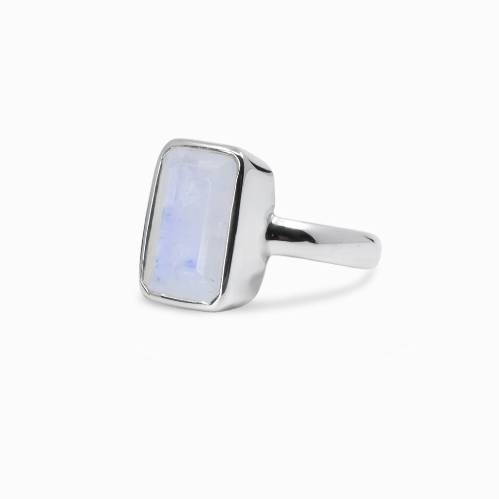 A dreamy white gem, with a sheen of a beautiful array of blue tones, Rainbow Moonstone is adored from every angle. This staple gemstone will compliment any look, with any stone for any occasion. The stone of new beginnings, this gem is also known as the traveler’s stone. Rainbow moonstone assists in carrying rainbows into one's life. It brings the white light of healing and the multi-colors activate each of the corresponding chakras. This Rainbow Moonstone ring brings movement and energetic relationships in the unfolding of one person's “great plan”.
