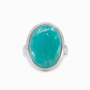 Russian Amazonite - a stunning turquoise-blue stone, with a contrasting white pattern that can soothe chakras, help eliminate worry and fear, and protect against negative energy. Amazonite stone creates a mystical lure that can be worn to brighten any outfit, as well as balance energies. This oval cabochon Amazonite ring allows the throat and heart chakras to open, enhancing communication regarding love. It's also a great stone to wear for general health maintenance.