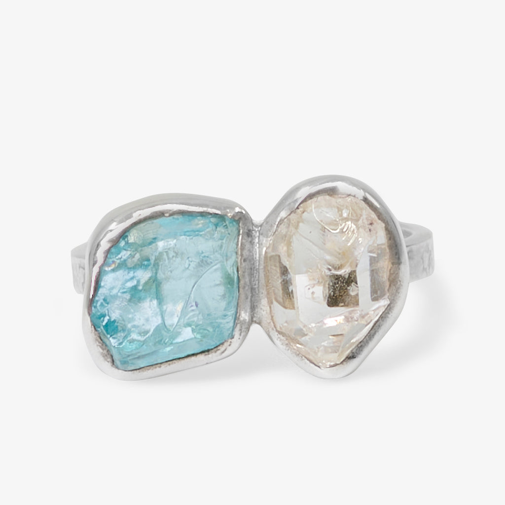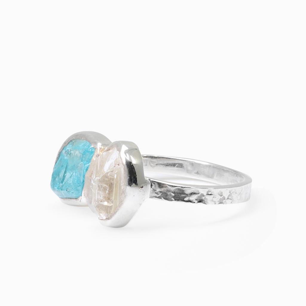 Minerals in their natural form display a unique type of beauty. This handcrafted piece centers a crystalline Herkimer Diamond between raw Apatite for an eye-catching combination.