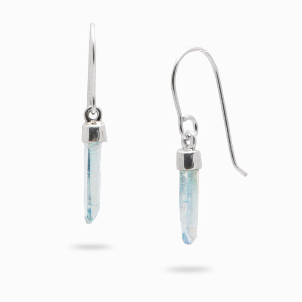The vibrant blue color and iridescent sheen on each raw quartz crystal are thanks to a microscopic layer of pure gold particles. Use the contrast of light blue color and raw crystal beauty to your advantage when styling up this gem. These Aqua Aura earrings can support meditation and rejuvenate the mind, body, and soul.