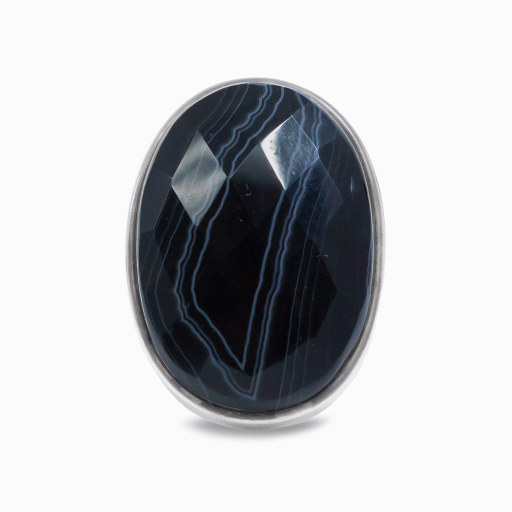 Alternating bands of black, white, and brown, Agate create a unique pattern in each highly polished stone. This Agate Ring has a balancing effect, allowing you to transform and eliminate negativity bringing both yin and yang energies into balance.