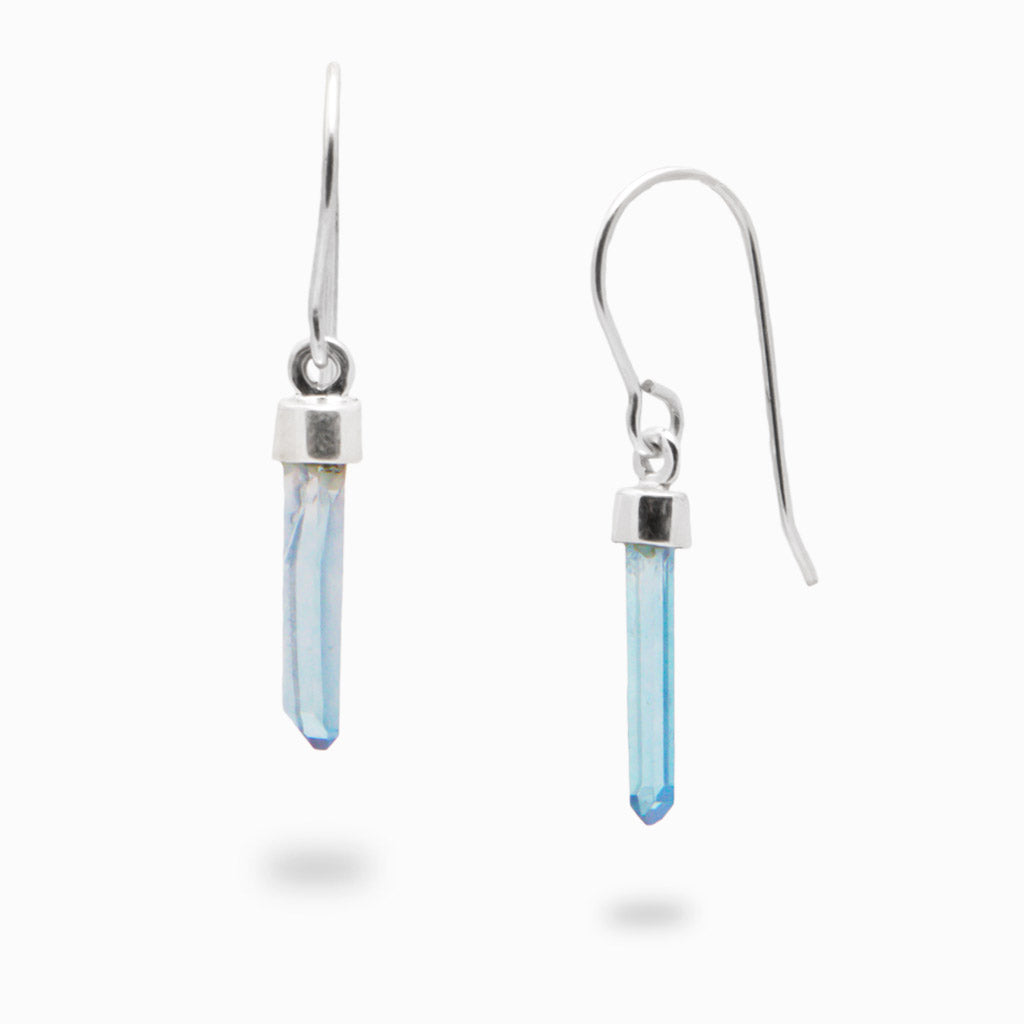 The vibrant blue color and iridescent sheen on each raw quartz crystal are thanks to a microscopic layer of pure gold particles. Use the contrast of light blue color and raw crystal beauty to your advantage when styling up this gem. These Aqua Aura earrings can support meditation and rejuvenate the mind, body, and soul.