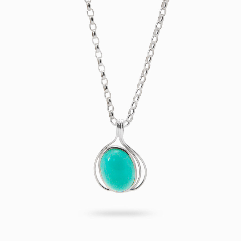 This beautiful turquoise green Peruvian Amazonite cabochon necklace adds a splash of color to any ensemble while also balancing the wearer. Amazonite crystals can assist in balancing all chakras, removing negative energy, and alleviating concerns and fears. Wearing an Amazonite necklace is good for one's health and well-being in general.