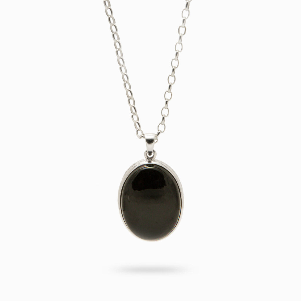 The Black Tourmaline gemstone from Australia is always a great look to any outfit. The smooth silky surface of this oval cabochon polished necklace in 925 sterling silver has a velvety blackness, and it is cut and polished from large crystal masses in the earth. This Black Tourmaline necklace will not only add to the beauty of your collection, but it will also protect you from negative energy.