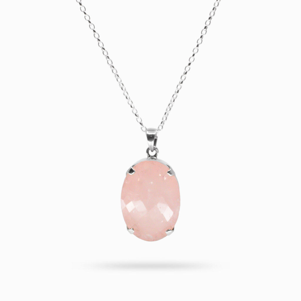 Soft, delicate, and radiant, this faceted oval Rose Quartz necklace glows with gentle pink hues that complement any outfit. Set to showcase the crystal’s natural beauty, it is both elegant and effortlessly wearable.
