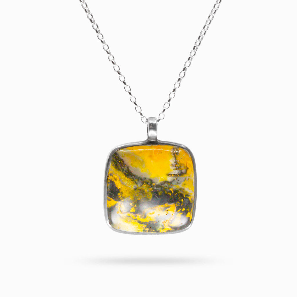 Vibrant and full of energy, this cabochon rectangle Bumble Bee Jasper necklace bursts with bold patterns of yellow, orange, and black — a natural work of art formed by volcanic activity. Set in sterling silver, its striking contrast and vivid tones make it a true statement piece, especially when paired with black, grey, or white attire.