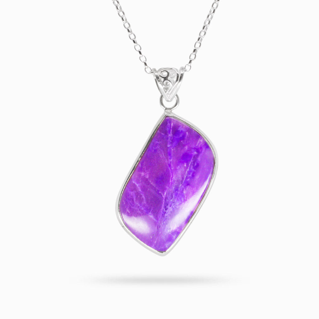 This extremely rare gemstone, found in only one location in the world, is cherished for its striking electric purple color. Wear this vibrant, perfect purple beauty to brighten any outfit—its bold hue effortlessly enhances any ensemble. Sugilite is renowned for its powerful healing properties, promoting both physical and mental well-being. Known as "the love stone for this age," it represents the perfection of spiritual love, allowing this energy to manifest on Earth. This stunning cabochon Sugilite necklace inspires a sense of freedom, filling its wearer with confidence, inspiration, and a deep connection to universal love.