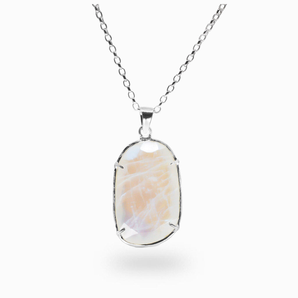 This dreamy white faceted organic Rainbow moonstone necklace with a sheen of beautiful blue tones will be adored from every angle. The stone for new beginnings, this gem is also known as the traveler’s stone. This Rainbow moonstone necklace assists in carrying rainbows into one's life. It brings the white light of healing and the multi-colors activate each of the corresponding chakras. It also brings movement and energetic relationships in the unfolding of one person's “great plan”.