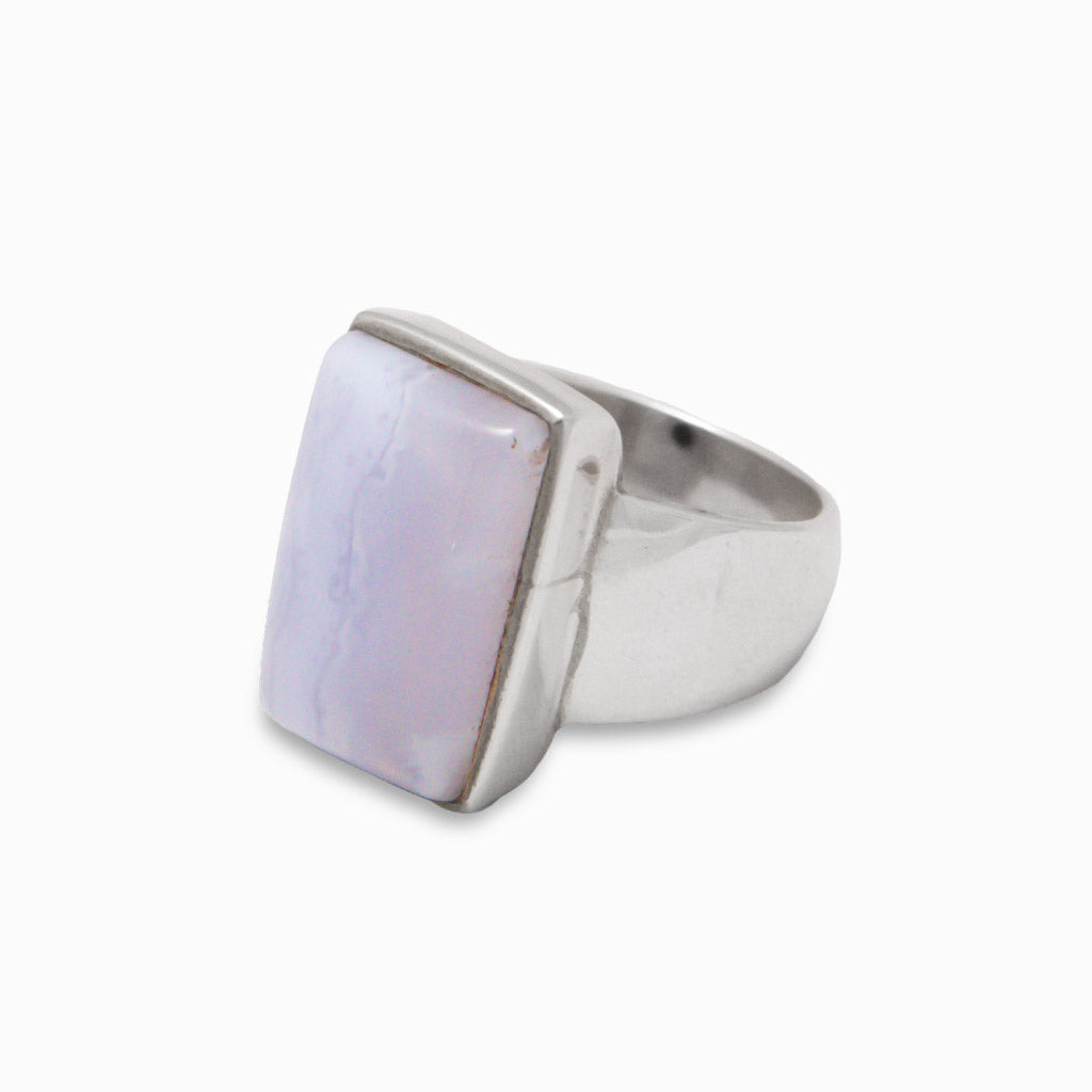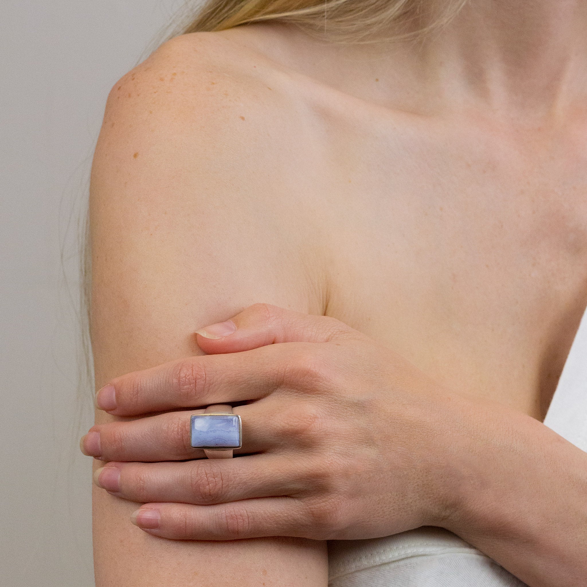 The color is vivid and lovely sky blue with lace-like white striped patterns. The unique Blue Lace Agate ring will complement any look. Embrace the qualities of flight, air, movement, and elegance as it serves as a motivating focal point, elevating the wearer to higher spiritual realms. The energy of this mineral will help the wearer open their third eye, crown, heart, and throat chakras.