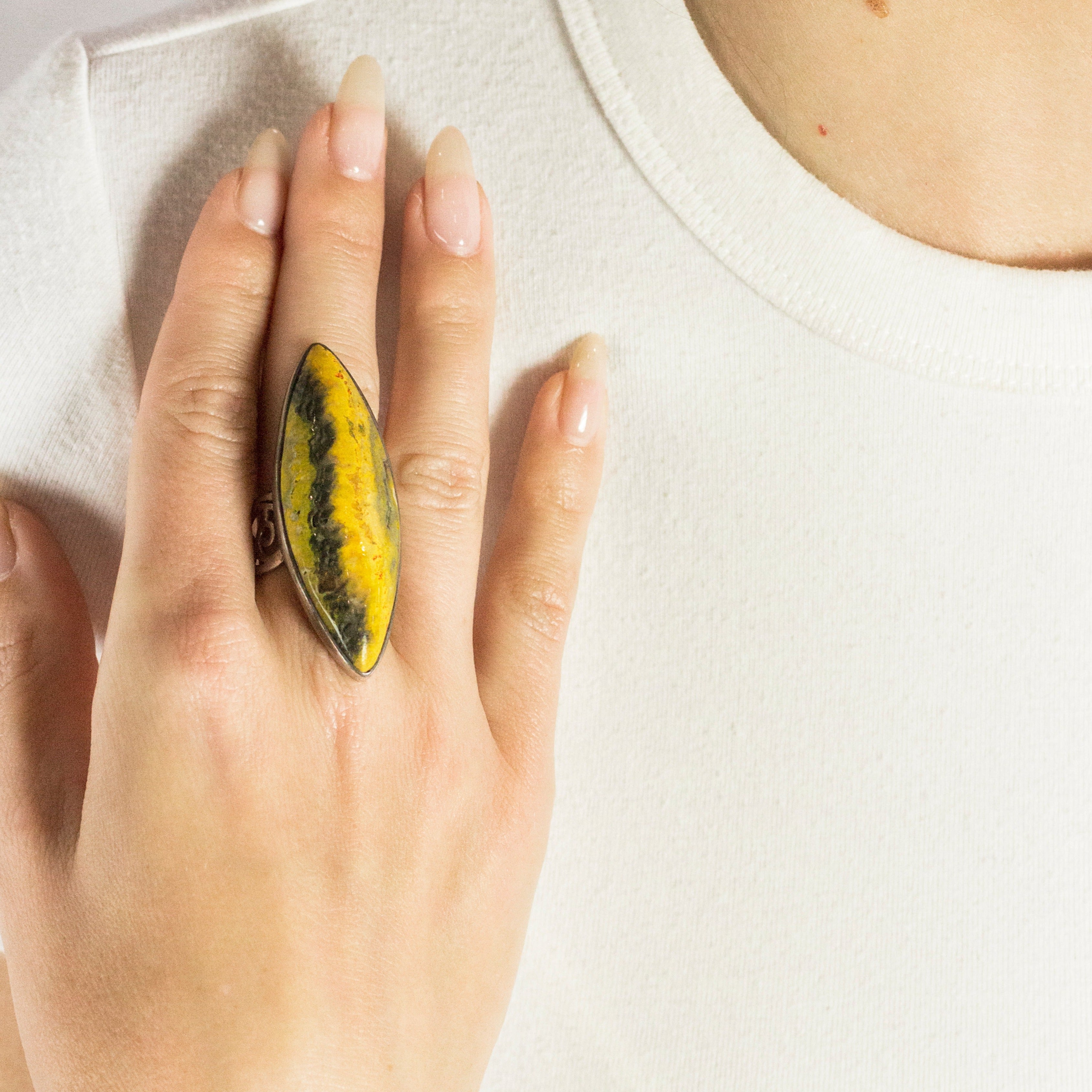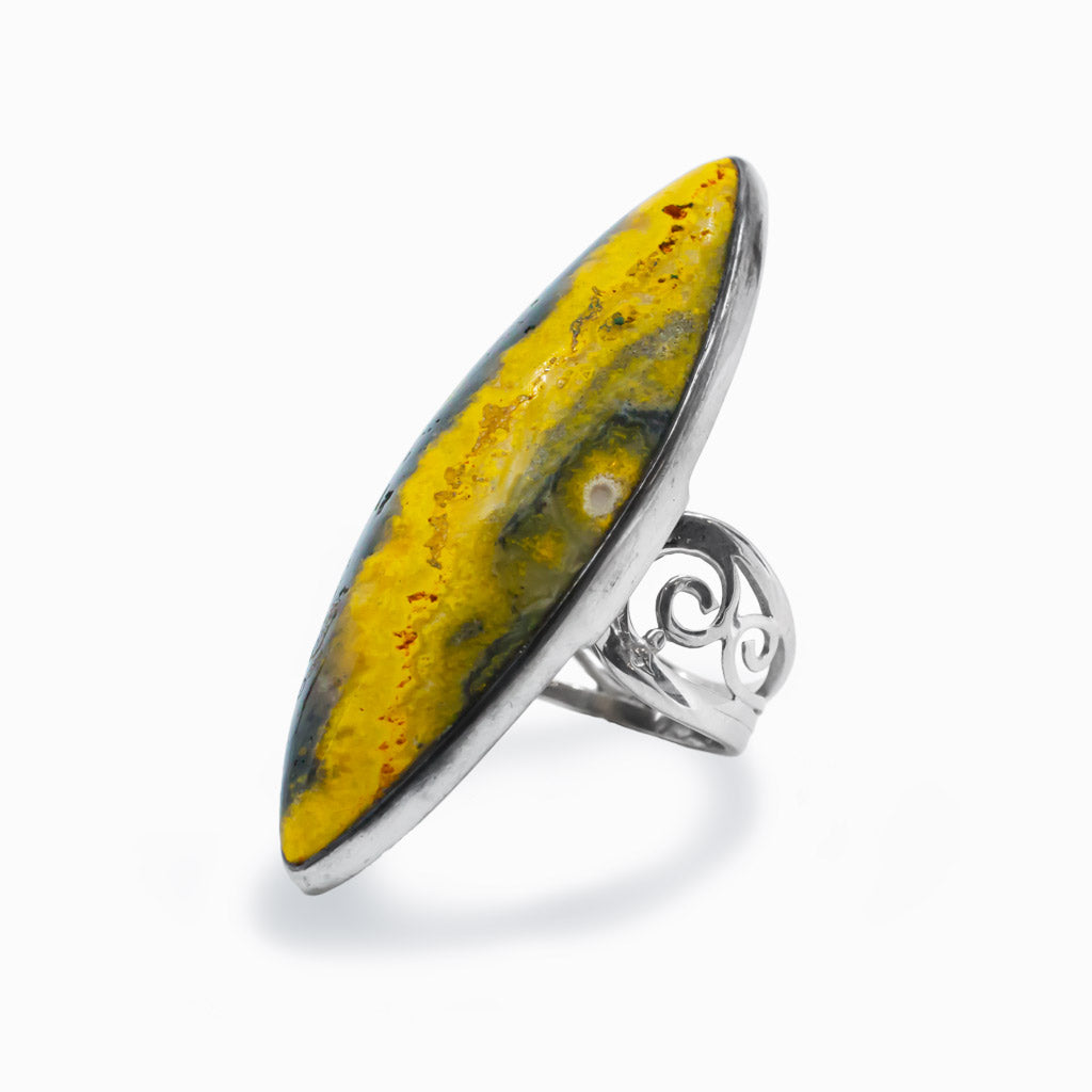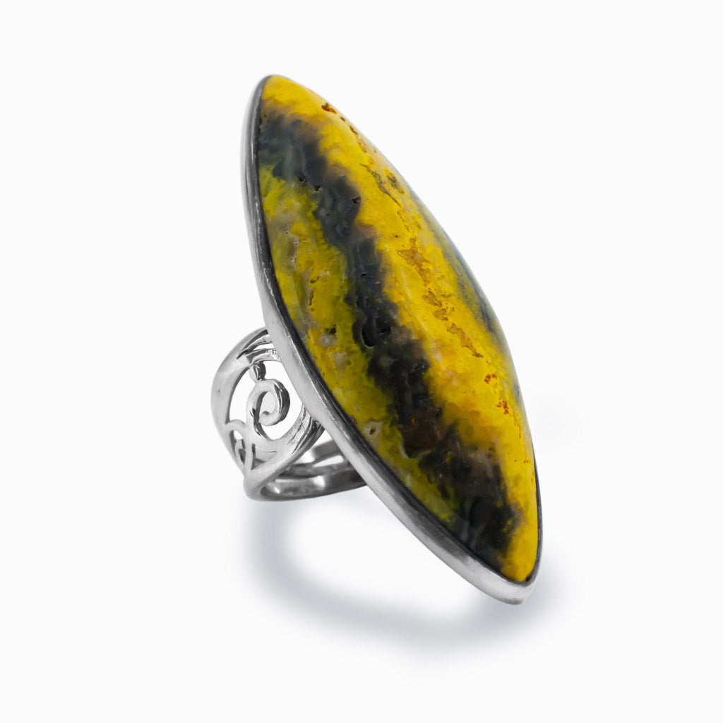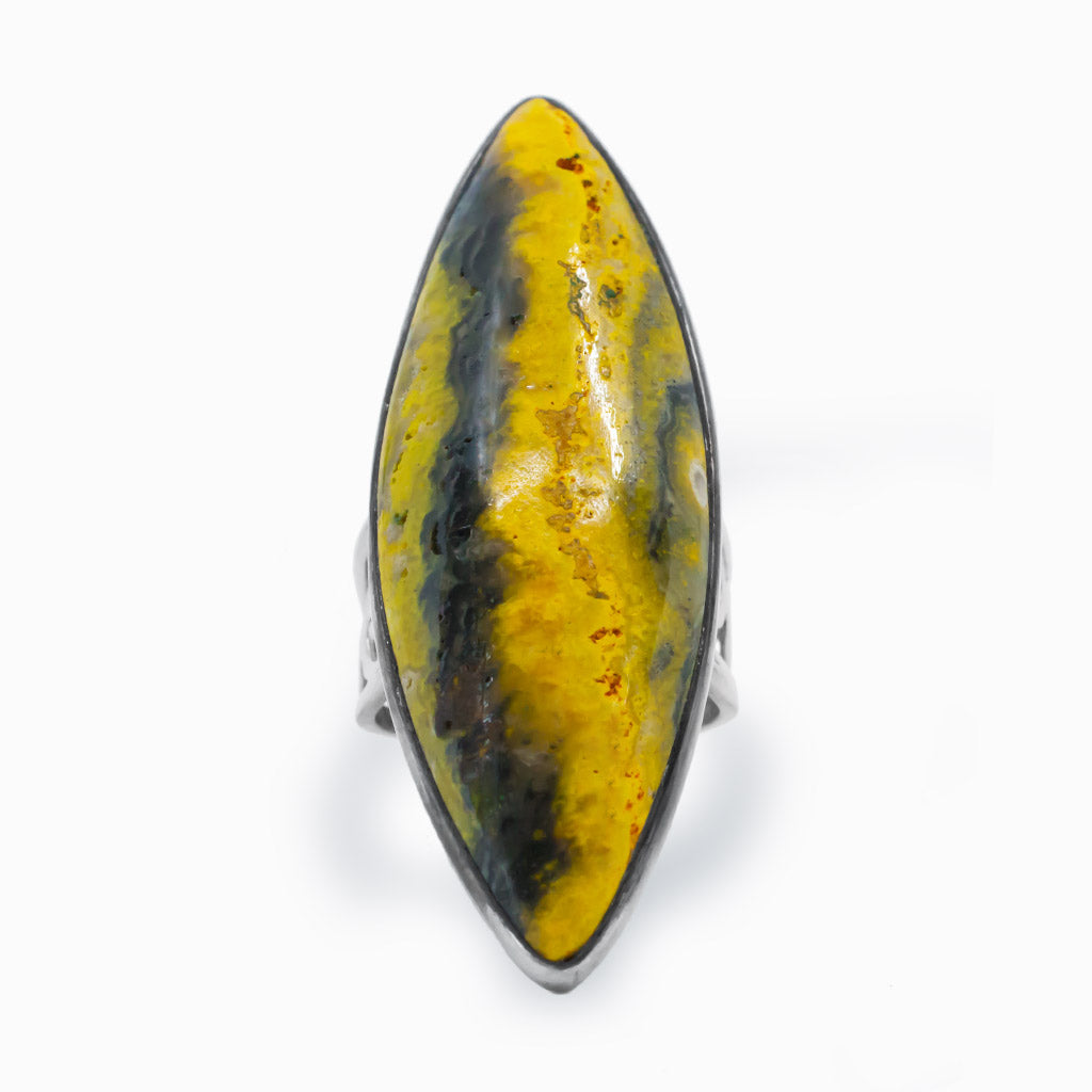 The designs on Bumble Bee Jasper come to life when worn with black, grey, or white, grabbing the attention of those who see them. This Jasper Ring aids in the acceptance of change, the discovery of new opportunities, and the development of self-confidence.