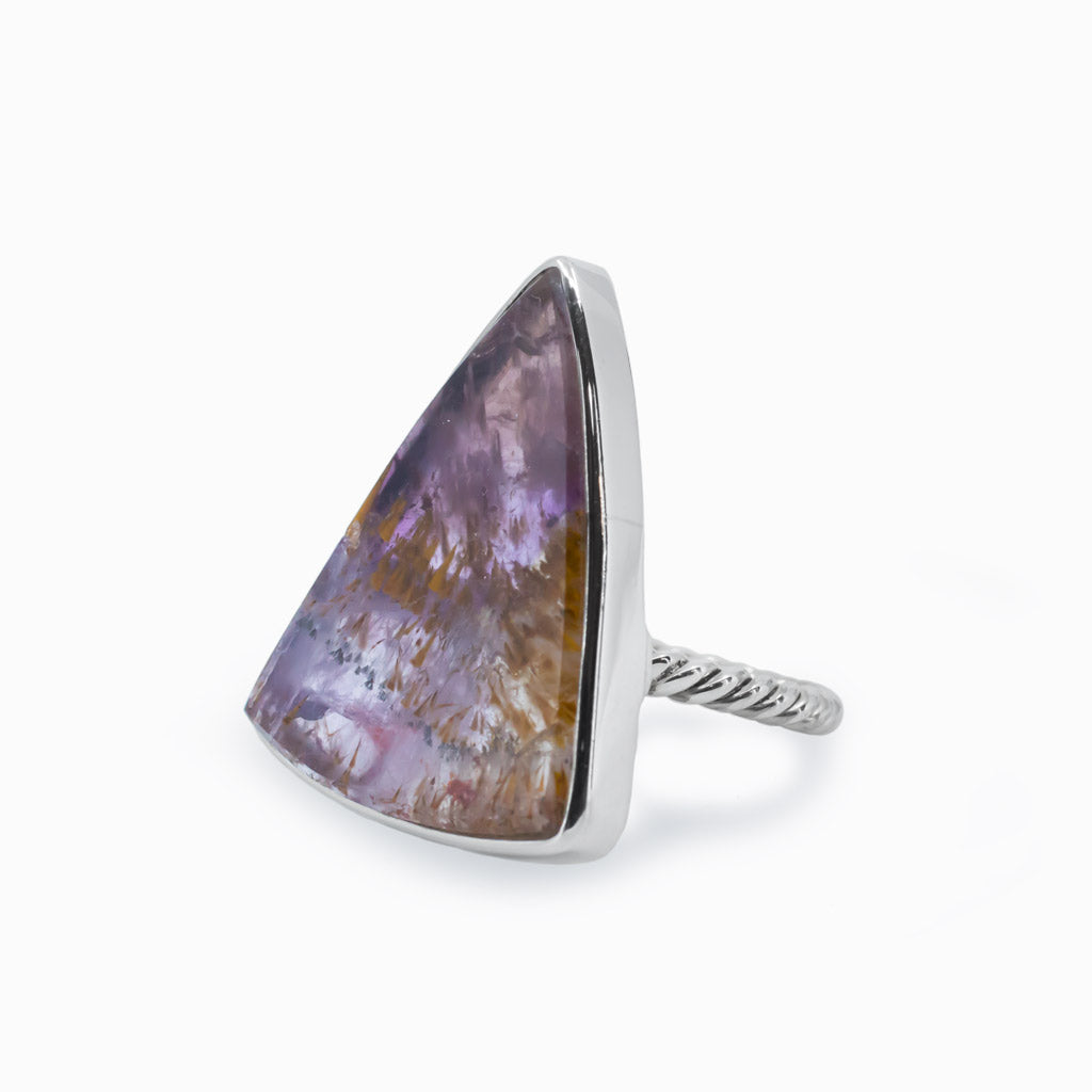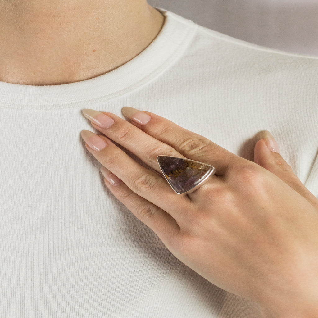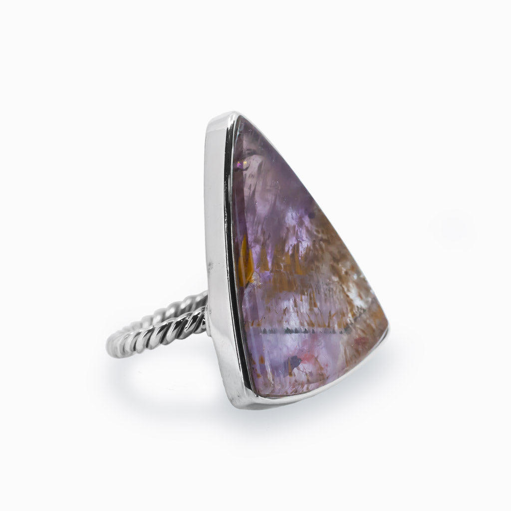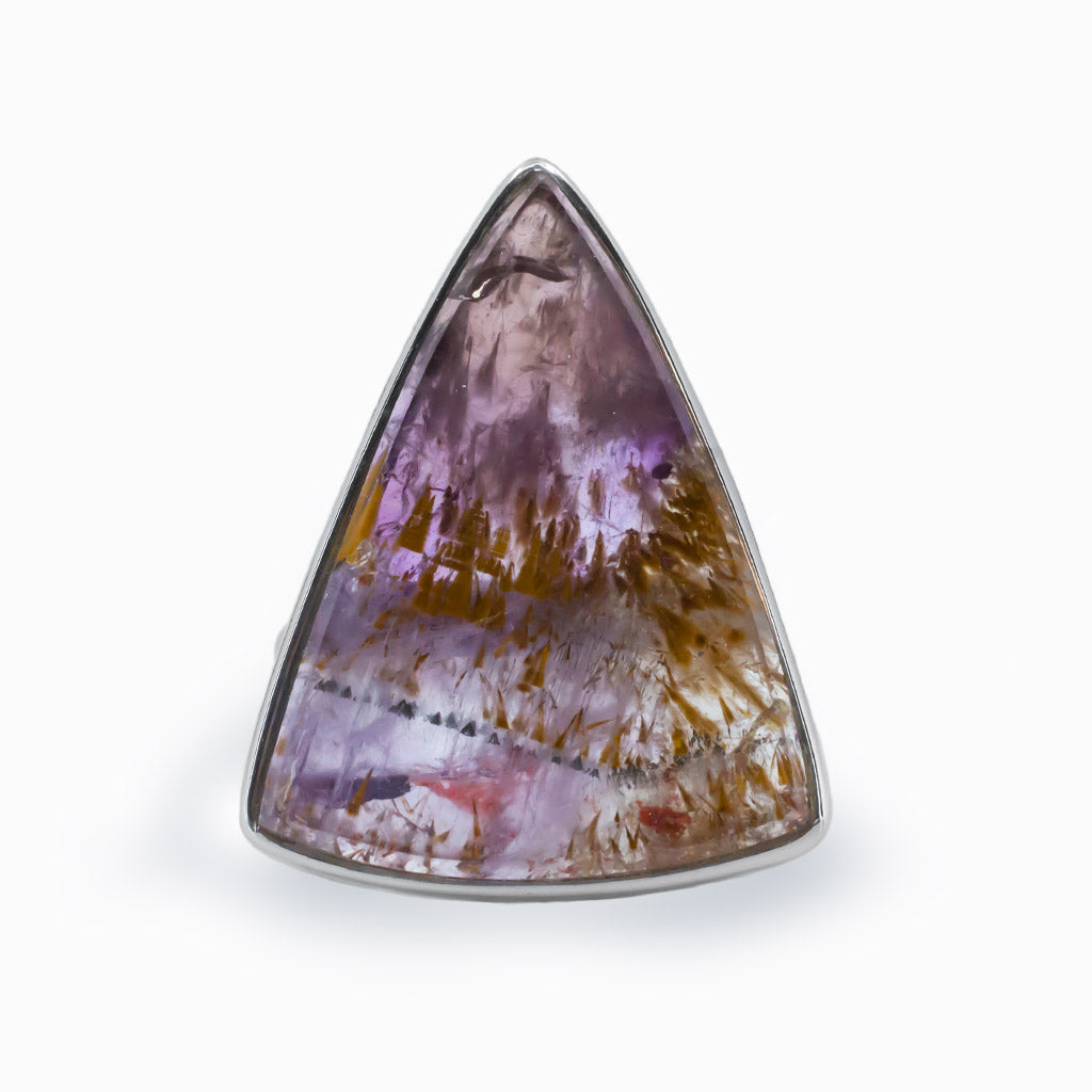 Beautiful golden Cacoxenite crystal inclusions within rich violet Amethyst, one of the most exquisite formations to occur within Amethyst. This remarkable gemstone should be worn as the centerpiece amongst your other jewels. Known as ‘the stone of ascension’, wear this crystal to increase spiritual awareness and allow you to see the positive, and bring wisdom and good to one’s life. This Cacoxenite ring has a creative energy that allows new things and ideas to be brought forth.