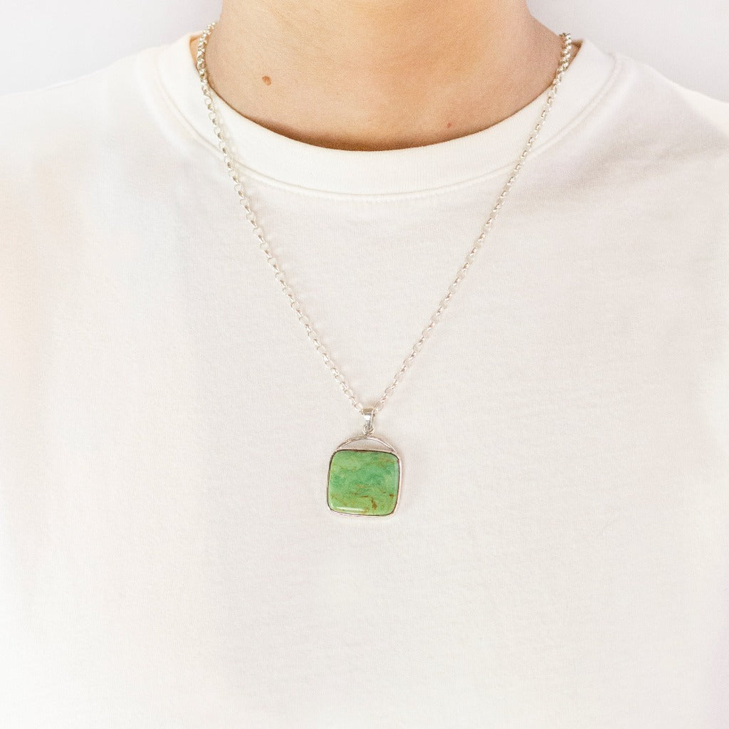 The Campo Frio Turquoise gemstone is a cool green gemstone that can brighten up your day and wardrobe. This Campo Frio cabochon necklace oozes smoothness and elegance. Wear this Turquoise Necklace set in 925 Sterling Silver for good fortune in life and in business.
