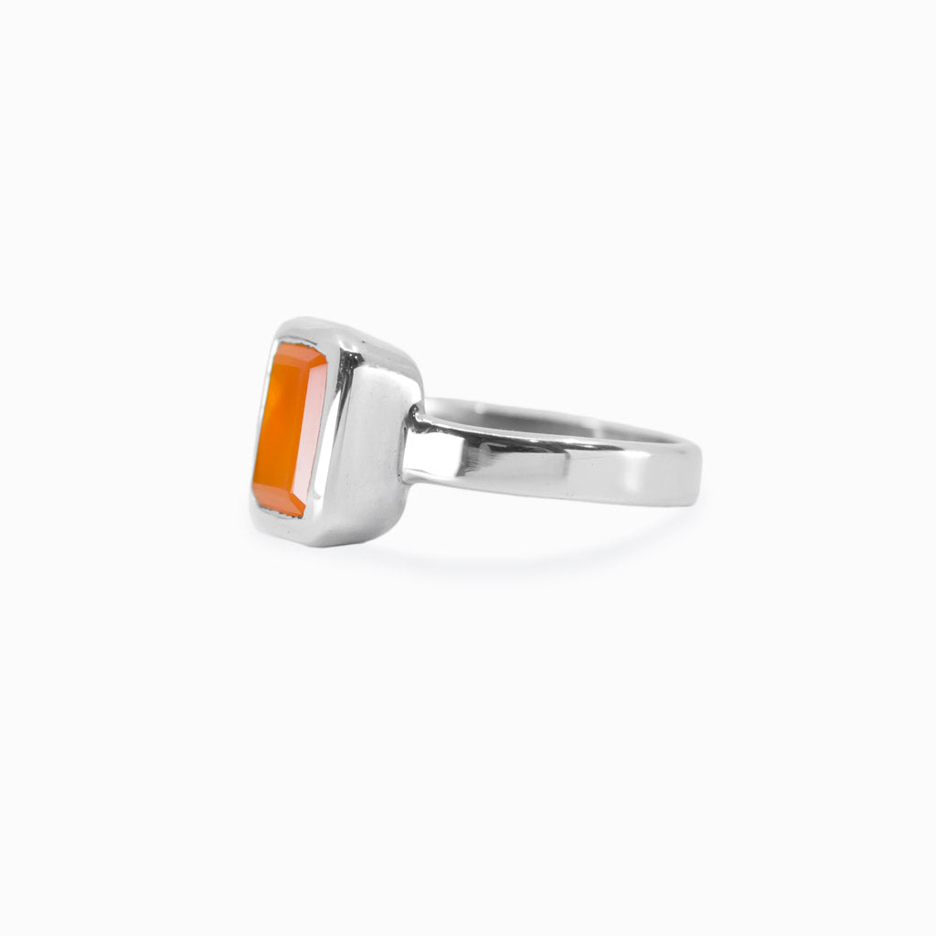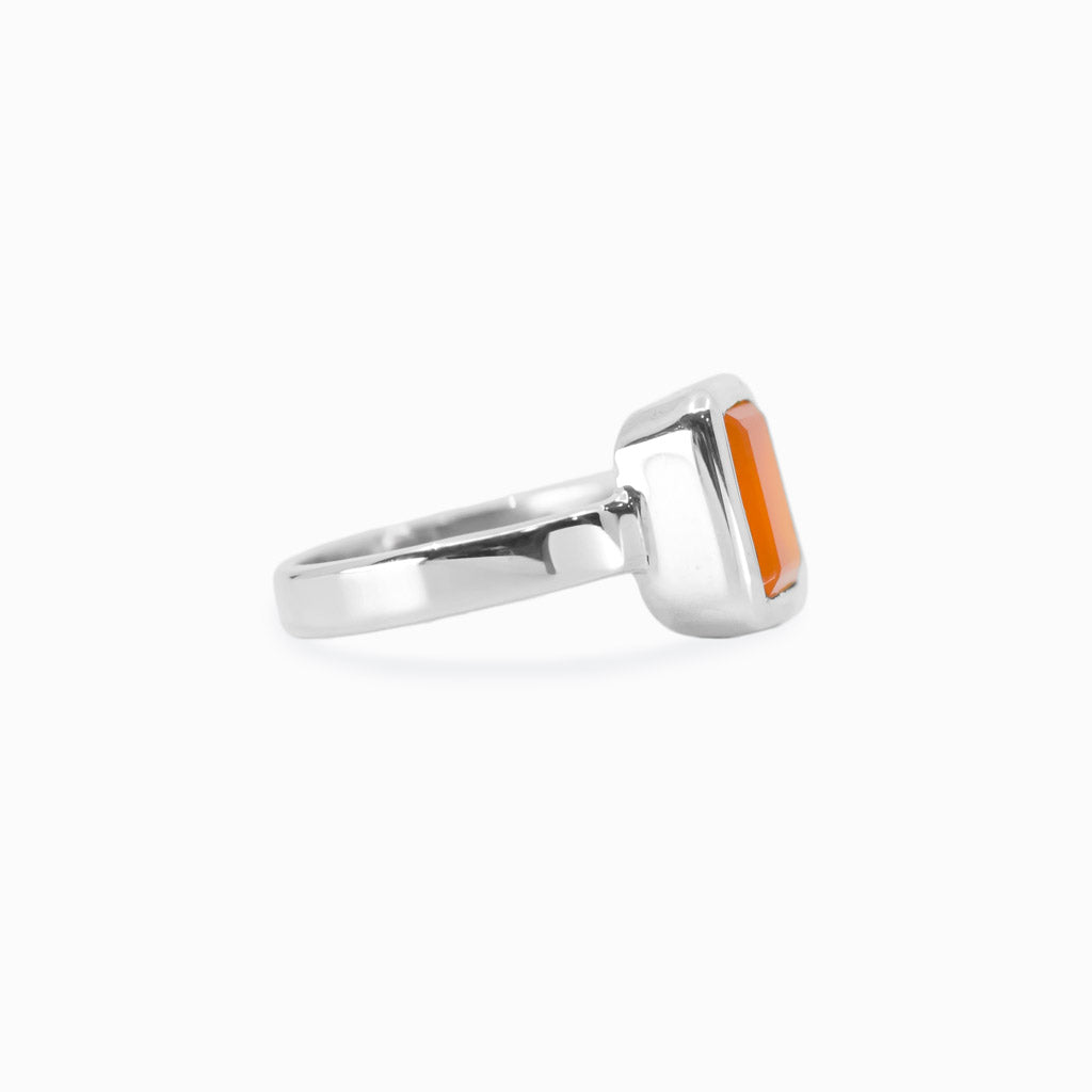With its brilliant orange and red-orange color, this sun-kissed-looking gem will add a burst of color and creativity to your everyday wear. This stone will stimulate its wearer's analytical capabilities and precision. It protects against envy, fear, rage, and will banish any sorrows, and brings an energy of love. This Carnelian ring cleanses negativity and provides perceptiveness, awakening one's inherent talents, abilities, physical energy, personal power, and compassion.