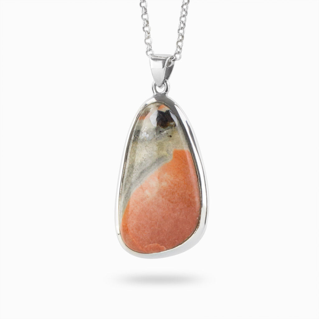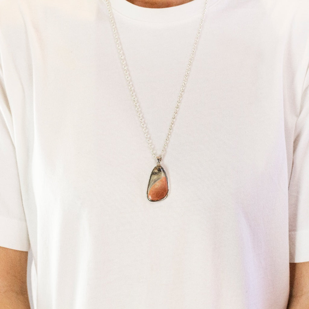 Celestobarite gemstone is a one-of-a-kind pinkish-salmon stone with grey/blue bands. This Celestobarite necklace is associated with the head and solar plexus chakras and is used in shamanic journeys.