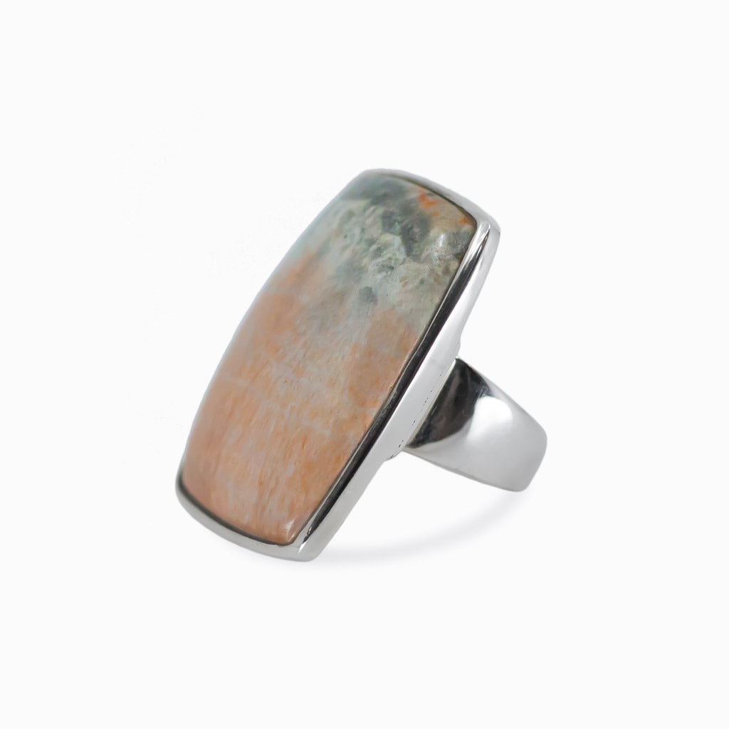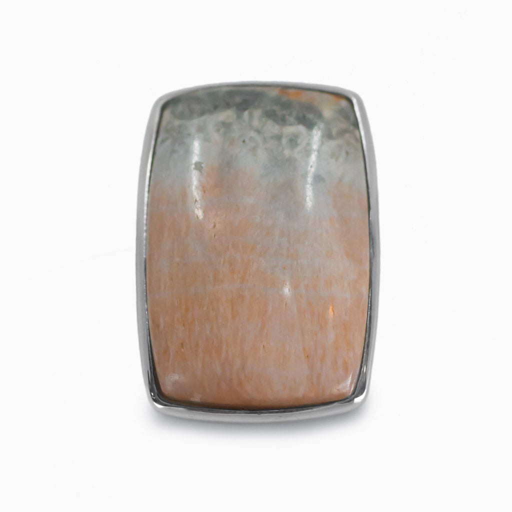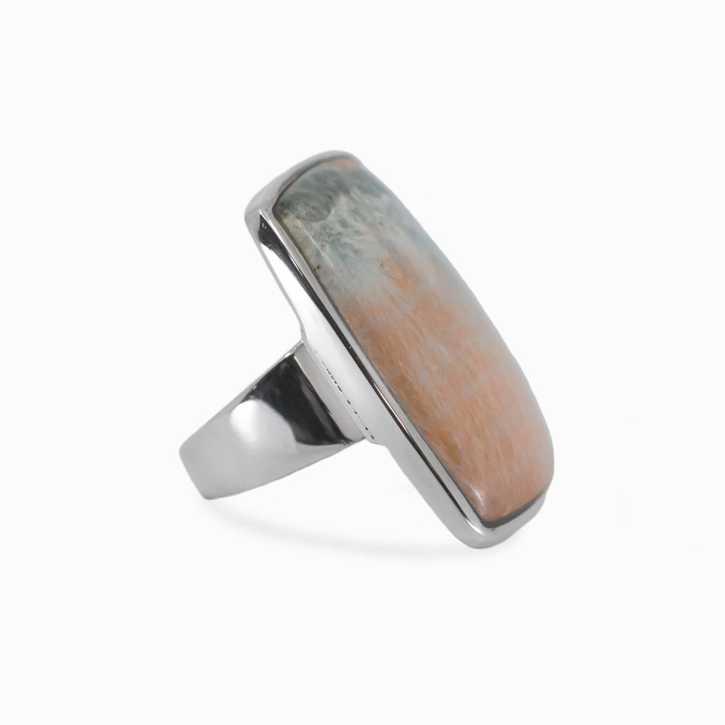 This Celestobarite stone is a one-of-a-kind salmon-pink stone with grey/blue bands. This oval cabochon Celestobarite ring is utilized for shamanistic journeys and connects to the crown and solar plexus chakras. The salmon pink provides a great contrast to the grey-blue bands. Sure to work best with neutrals and earthy undertones.