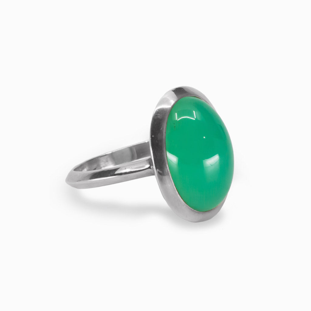 Loved for its bright, vivid apple green color, this understated Chrysoprase ring gemstone will add a subtle pop of color to your everyday look. The gorgeous gem is known for activating, opening and energizing the heart chakra allowing its wearer to bring the energy that is necessary to the physical body, through the loving energy of the heart. Chrysoprase facilitates adaptability and self-acceptance. In history this gemstone was also popular; Worn by Alexander the Great on his belt as a good luck charm and by Cleopatra who believed it helped retain her youthful beauty.