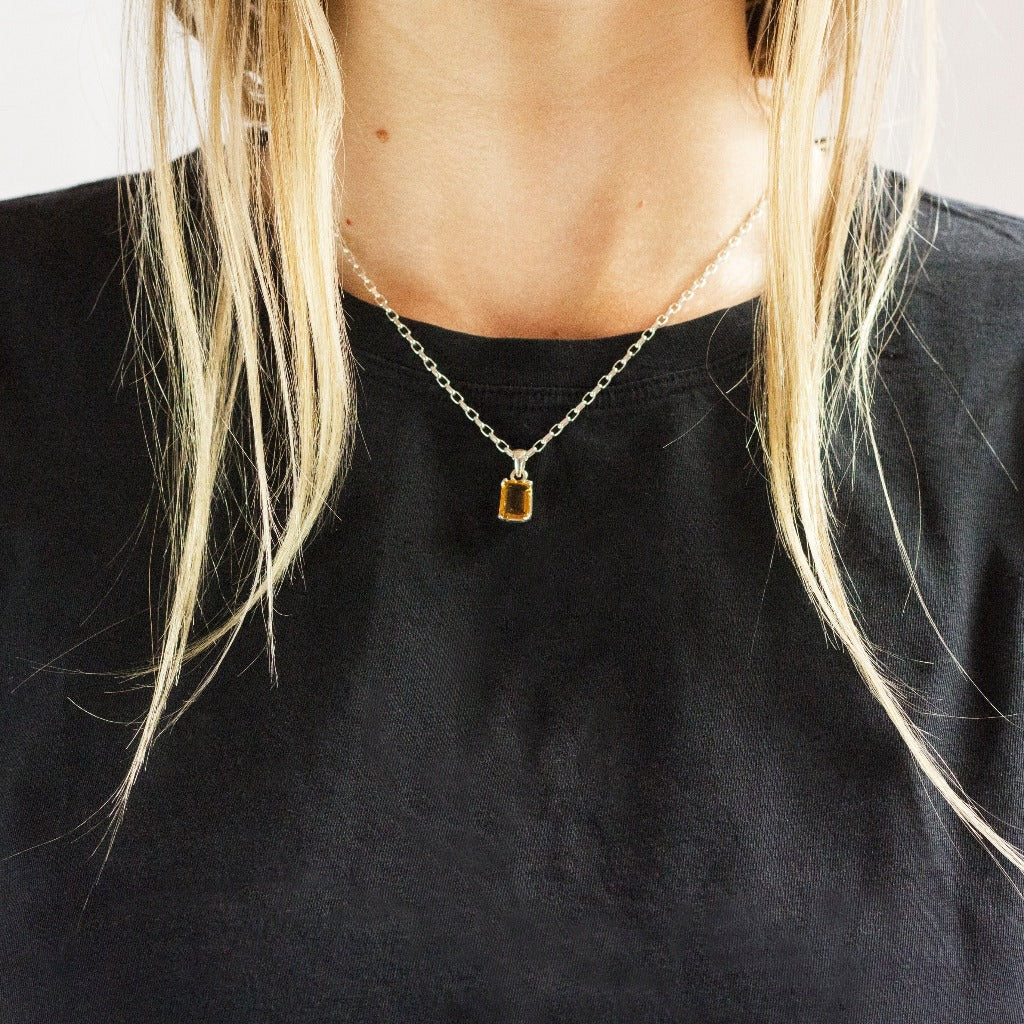 This rectangle claw Citrine crystal is the perfect gem for everyday wear. Carrying the power of the sun, Citrine is known as the stone for abundance and wealth. Use this gem to energize, and warm your spirit. This Citrine necklace is also a special gem as it does not hold or accumulate negative energy so it does not need cleansing.