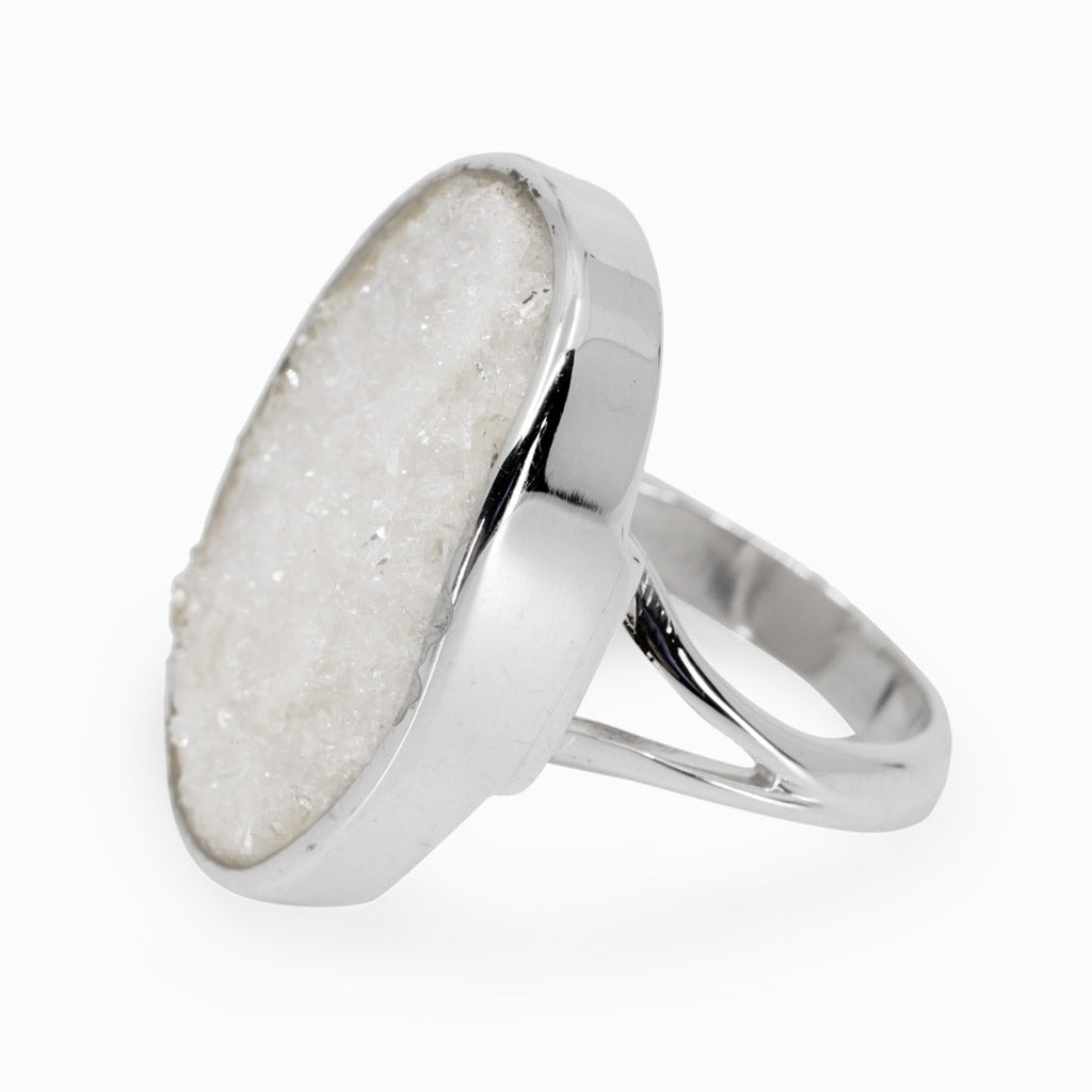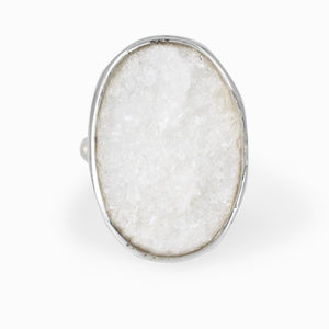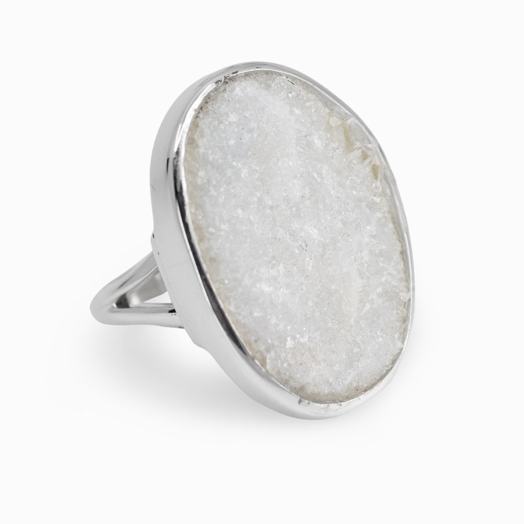 Crystal clear and effortlessly mesmerizing, Clear Quartz druzy crystals create an enthralling sparkle, making it a piece to wear daily. It is a wonderful cleansing stone that will amplify one's energy and thoughts, providing clarity in thinking. Known as a “stone of power” and is said to bring the energy of the stars to the soul. Wearing this crystal beauty will harmonize and align one's energies – thoughts, consciousness, emotions – with the energies of the universe. When this Quartz ring is used for meditation is useful in relaxing the mind, easing it into a rejuvenating state.
