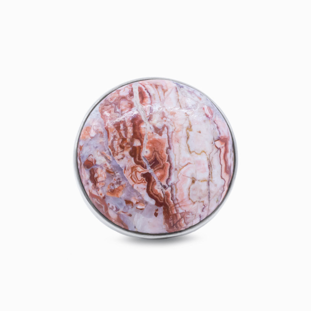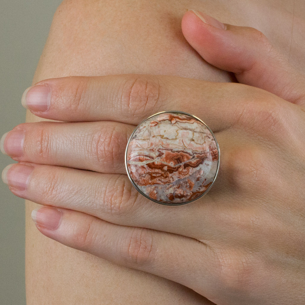 This Crazy Lace Agate gemstone, reminiscent of the Australian desert, pairs well with earthy tones and allows you to be creative with your style; its bold design speaks for itself. This Agate ring has patterns that create a cyclical flow of energy that invigorates the mind and spirit while also promoting laughter and vitality.