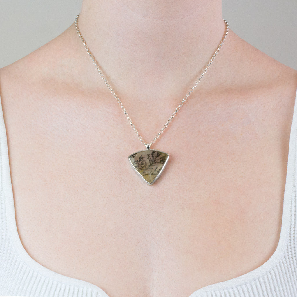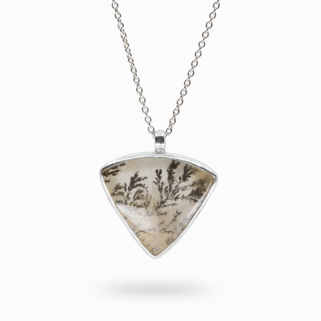 Dendritic Quartz is a stone in the form of ferns giving this clear quartz a beautiful look. Allow this triangle bezel cabochon pendant to be a part of any season's style. This stone can aid mental clarity as well as a deeper sense of self-connection. This Dendritic Quartz necklace is said to help people feel more connected to nature and a sense of connection to Mother Earth.