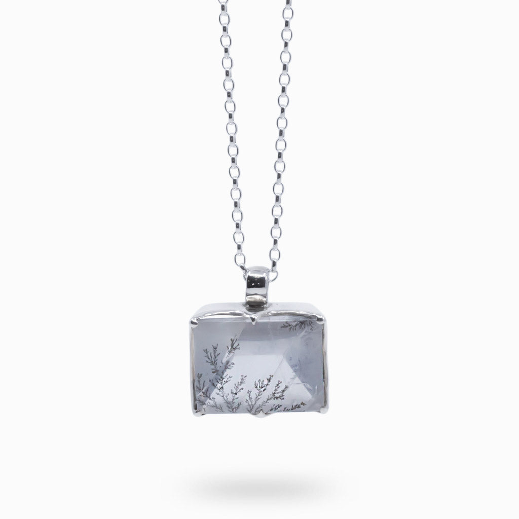 Clear Quartz stone with fern-like Dendritic inclusions that give it a lovely appearance. Allow this rectangle bezel cabochon pendant to complement any look and season. This Dendritic Quartz Necklace can help you gain mental clarity and a stronger sense of self-connection. Dendritic Quartz is said to promote a closer relationship with nature and a sense of belonging to Mother Earth.