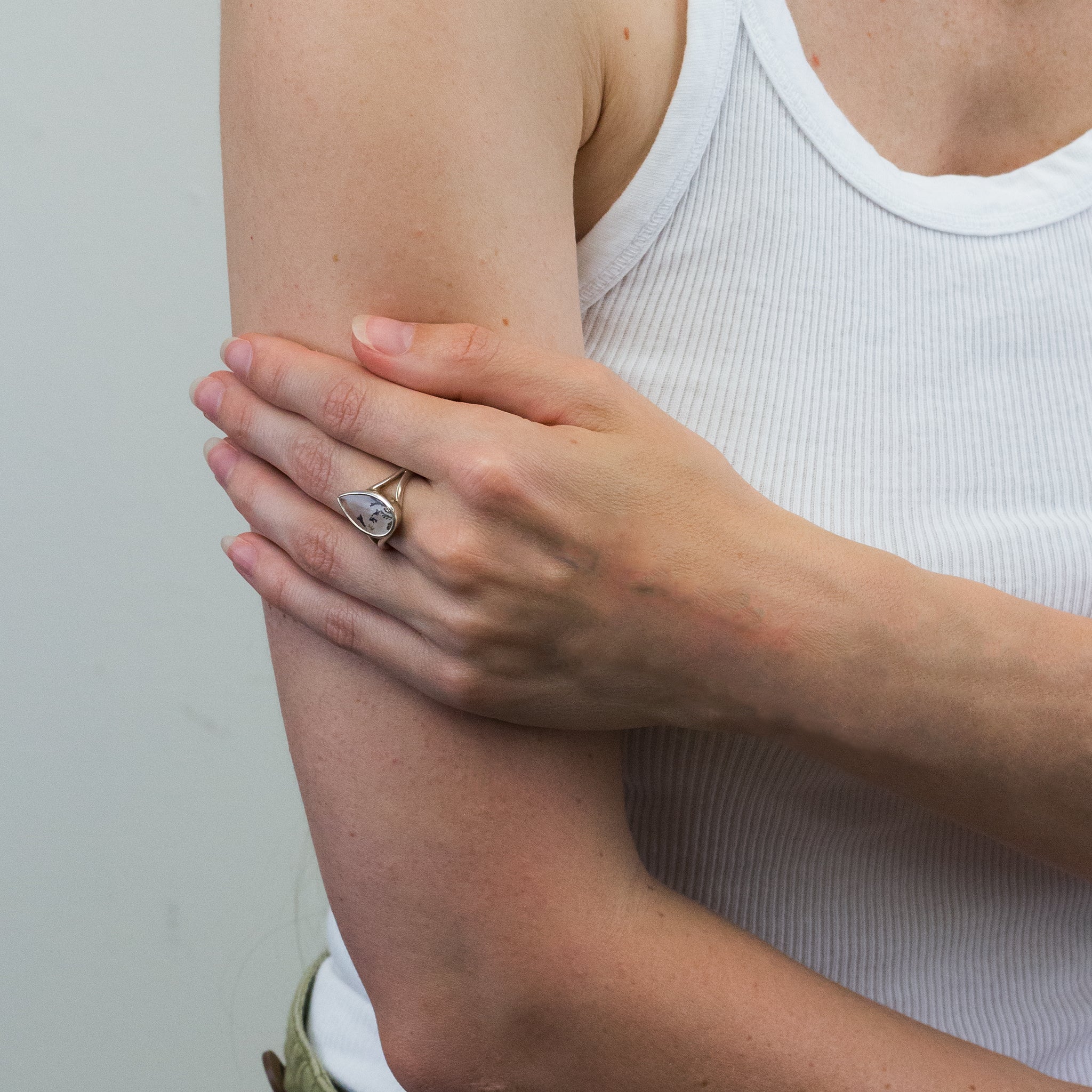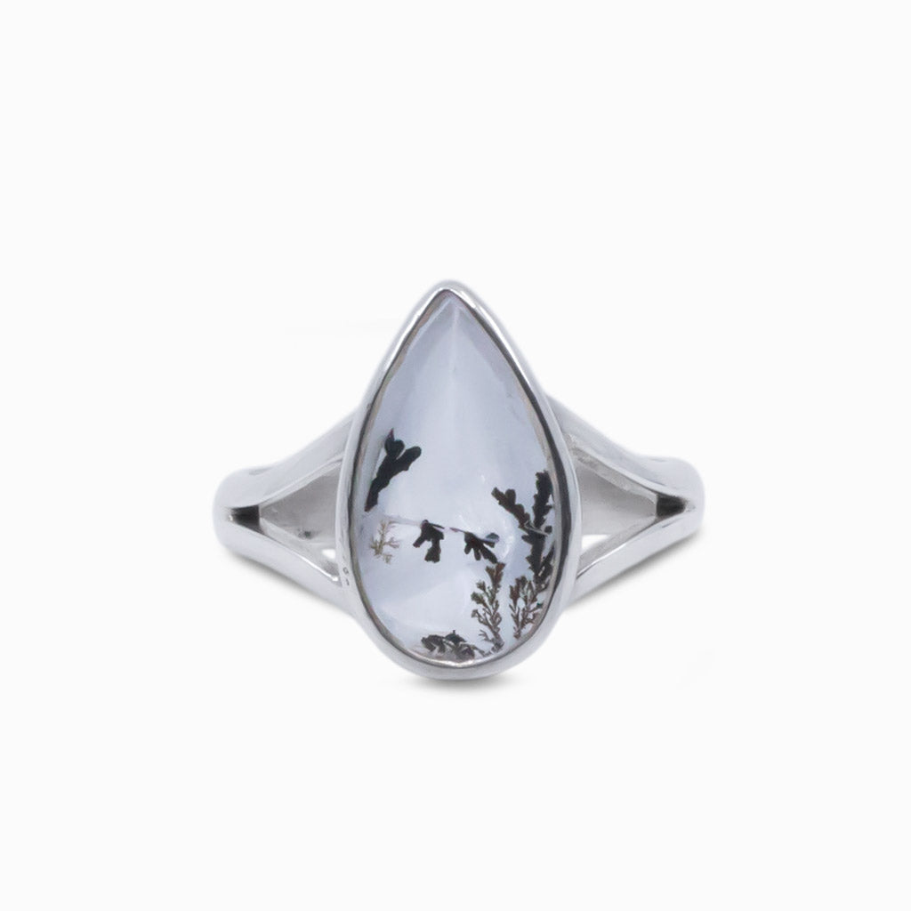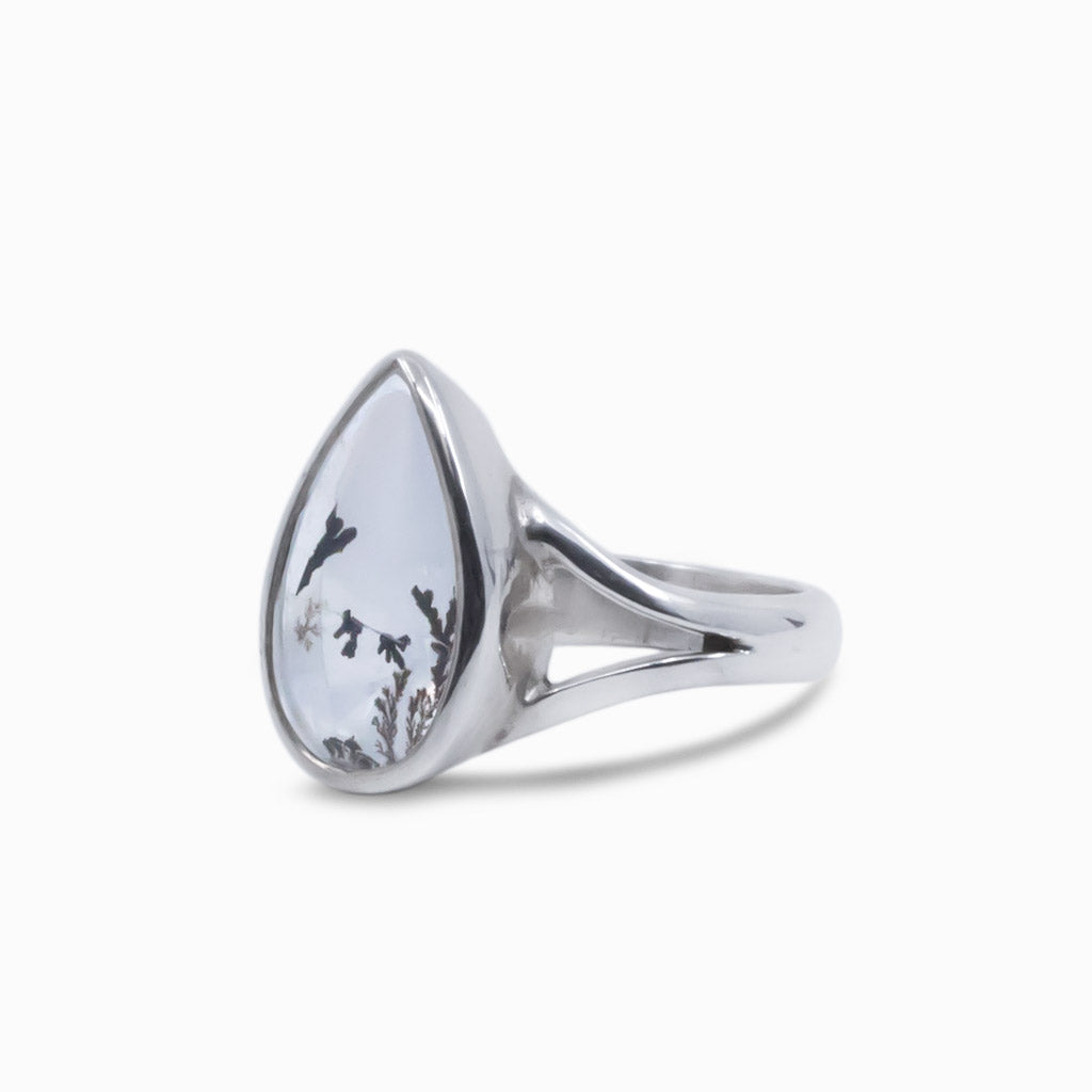 Clear Quartz with delicate fern-like Dendritic inclusions that create a picturesque quality. Let this gem be an addition to any style in any season. This stone can bring you clarity of the mind and a higher self-connection. This Dendritic Quartz ring is known to facilitate closeness with nature and a connection to mother earth.
