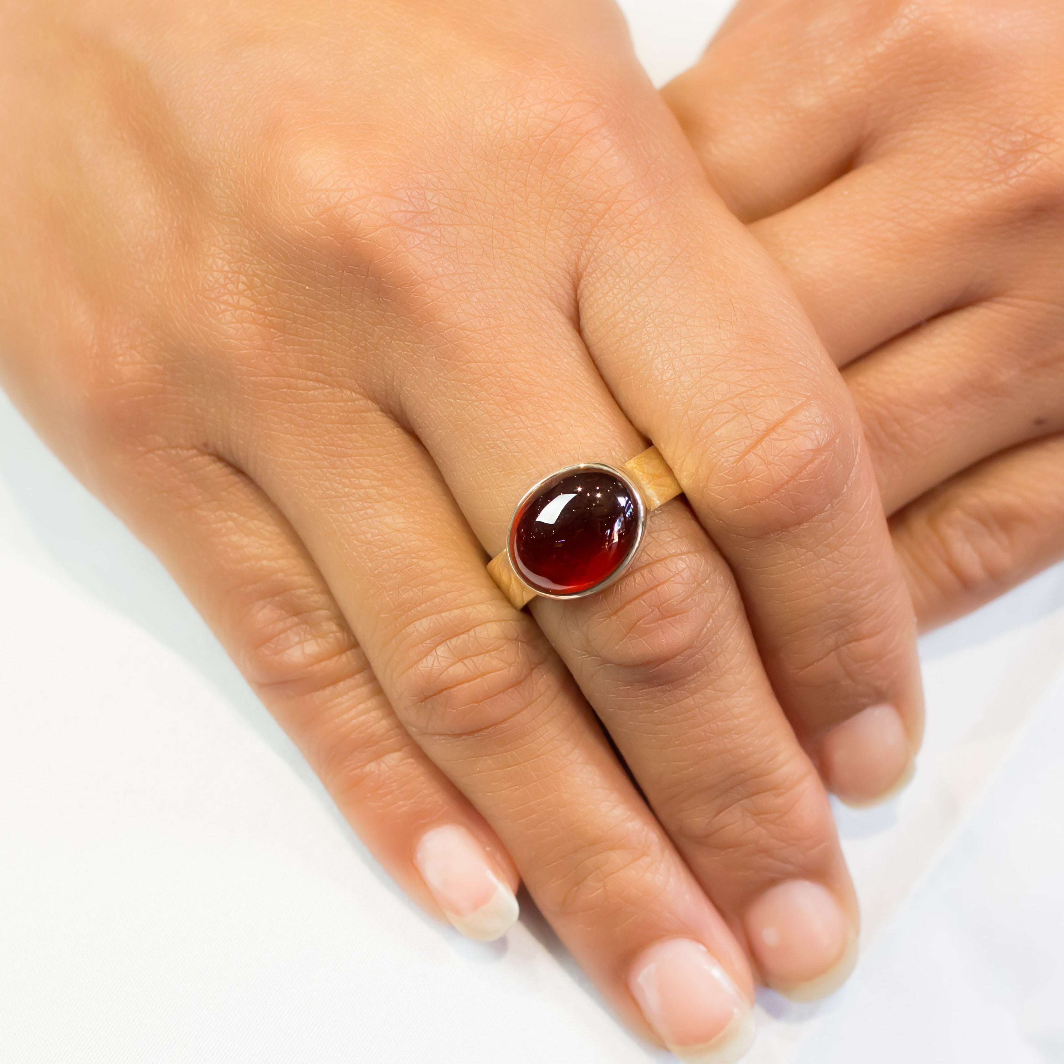 A deep rich red with a lustrous polish. The Garnet gemstone is a staple gemstone that is essential to any jewel collection. Known as the “stone of health” wearing this stone extracts any negative energy from the chakras, transmuting the energy to the beneficial state. This Garnet ring is also known as the “stone of commitment” – to purpose, to others, and to oneself.