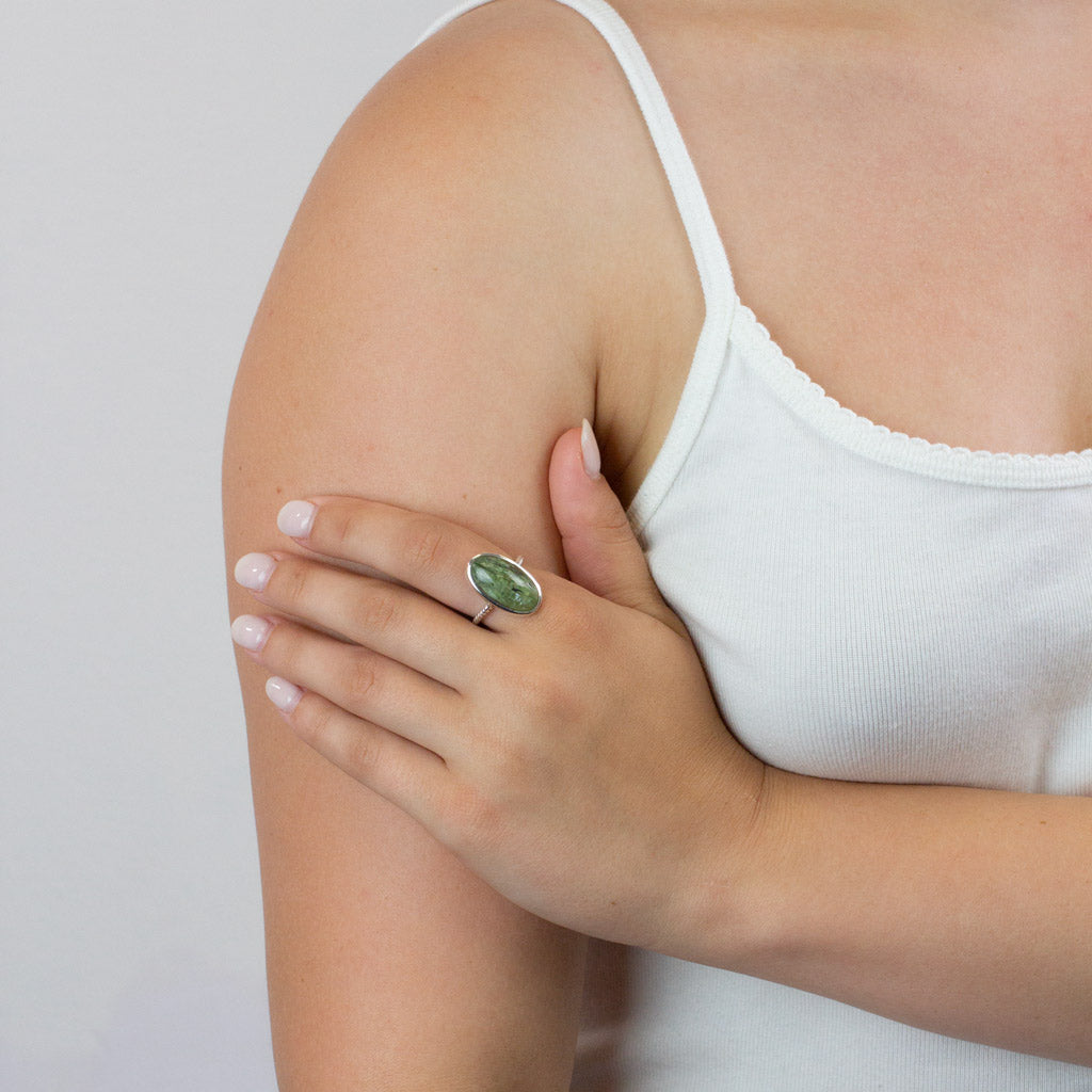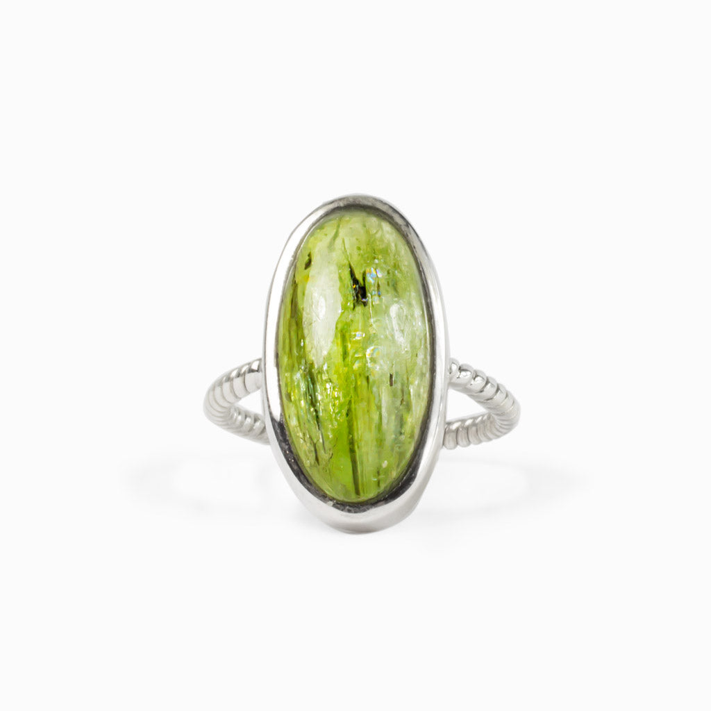 Green Kyanite is suitable to wear with any ensemble and will compliment any look. The Kyanite ring is one of the few minerals that never needs cleansing or clearing, as it does not retain any negative energy or vibrations. Wearing this Kyanite gemstone aligns all chakras, bringing you tranquility and a calming effect to ones whole being. It is the perfect stone to facilitate meditation.