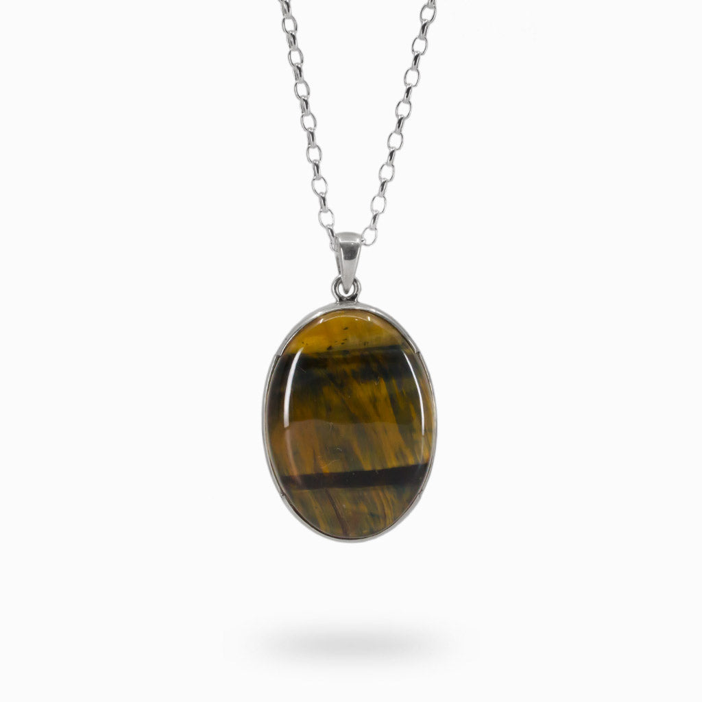 Light glistens over the deep navy blues and golden yellow silk fibers of our Hawks Eye necklaces. Dress this gemstone for elegance or casual fun, it will add a playful twist to your daily look, or pair it with your night-time glam, you can wear this versatile cabochon necklace from the day into the night. This Hawks Eye Necklace helps stimulate wealth and optimism whilst eliminating your ‘blues’.
