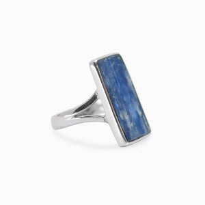 Fine-bladed crystals of blue and white Kyanite form a raw jagged shape. This blue beauty will compliment any look. Kyanite is one of the few minerals that never need cleansing or clearing, as it does not retain any negative energy or vibrations. Wearing this Kyanite ring aligns all chakras, bringing tranquility and a calming effect to one’s whole being. It is the perfect stone to facilitate meditation.