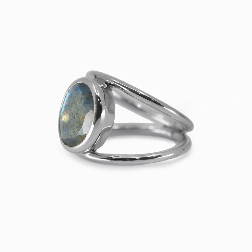 With an electric blue & sometimes multi-colored sheen, this oval faceted labradorite ring set in a handcrafted 925 sterling silver bezel split band will demand attention! The stone of vitality, Labradorite allows you to be you.