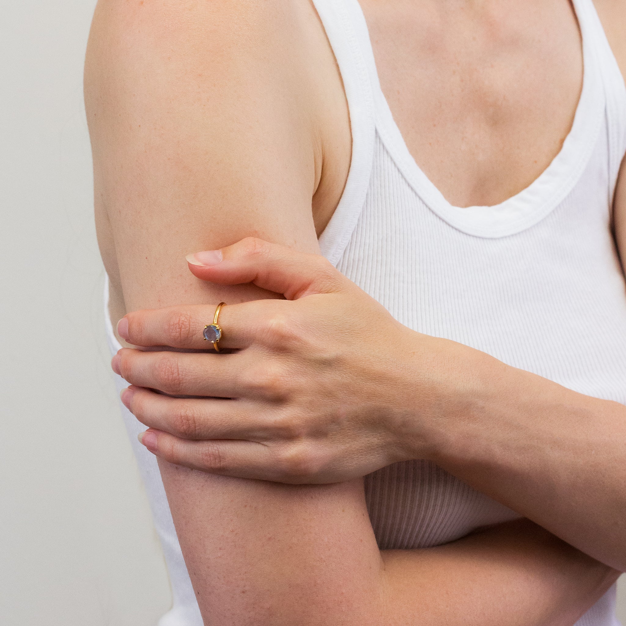 With an electric blue and sometimes multi-colored sheen, this translucent grey gemstone ring will demand attention! The stone of vitality and originality, this Labradorite ring will allow you to be yourself.