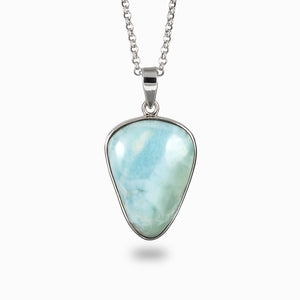 This lovely organic Larimar necklace will compliment any look. This beautiful gemstone has gorgeous patterns within, reminiscent of a summer sky. This crystal is known for its properties to promote inner wisdom and truthfulness.