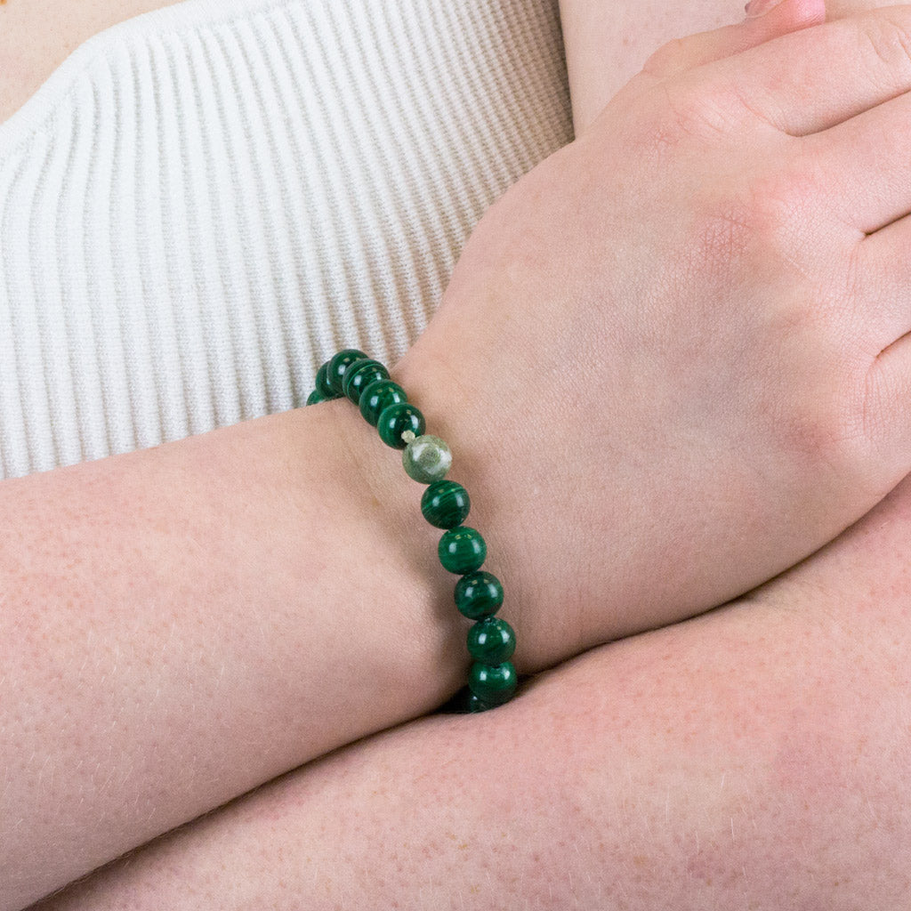 This Malachite bracelet is an intriguing green-banded beauty that will also have those around you green with Envy. A great gemstone to wear as a statement piece and is known as the “stone of transformation”. Allow Malachite to assist you in changing situations and help you release any negative experiences.