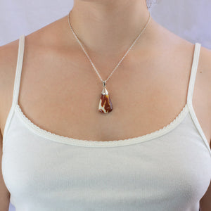 This Mookaite necklace features stunning red, yellow, and white designs that are earthy and dramatic. The warm-toned patterns of this Mookaite necklace sparkle from its cabochon polish, giving the piece a distinctive flare. It pays respect to its home, the Australian Outback. For a playful and vibrant take on an everyday look, use this gemstone necklace with other earthy tones and jeans. It is set in 925 sterling silver. Mookaite is a potent stone for protecting against harmful energy and promotes a variety of energies. The barrier it creates for its user is robust and safe, increasing their awareness of their immediate surroundings and helping them to be more "alert" when they are under attack. Additionally, this Mookaite necklace can help you develop greater self-compassion and others.