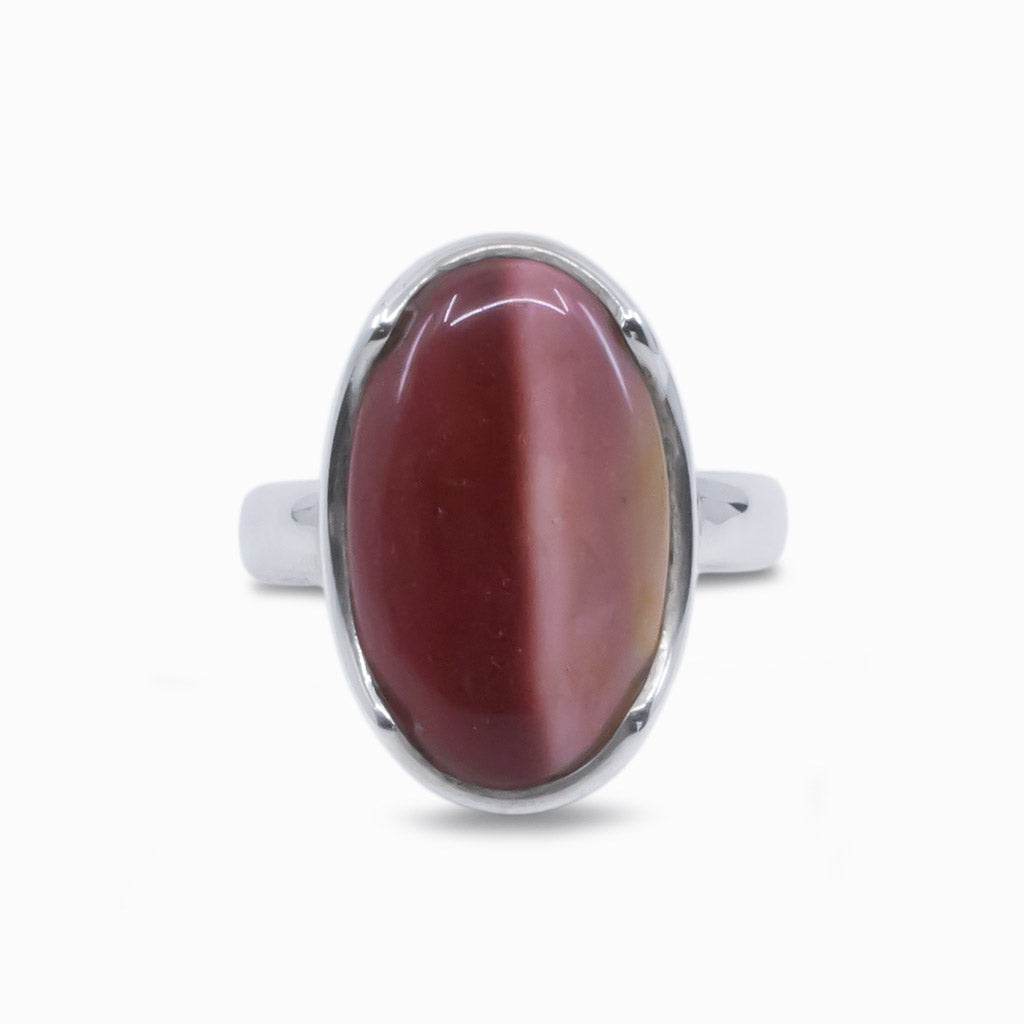 Mookaite features hues and patterns that are reminiscent of its origin, the West Australian Outback. This protecting gemstone springs to life with its warm tones of pink, yellow, and cream, and various designs and patterns to keep all onlookers engaged. Combine earthy tones and denim with this Mookaite ring with a 925 sterling silver band for a fun take on an everyday outfit. The Mookaite gemstone is a great stone for guarding against bad energies and promoting a cornucopia of energy. Mookaite gives a barrier of strength and protection to its user, increasing awareness of one's immediate surroundings and helping one to be more "alert" when threatened. Wearing this Mookaite ring can also help you be more kind to yourself and others.