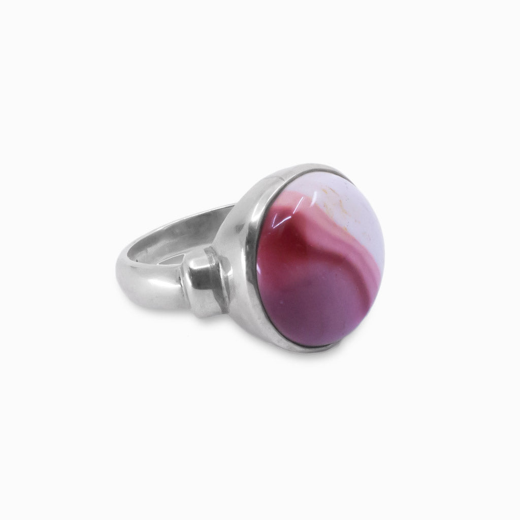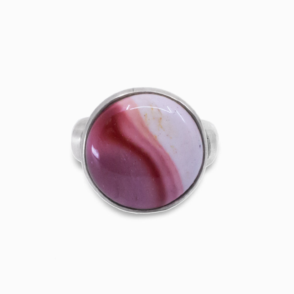 Mookaite features hues and patterns that are reminiscent of its origin, the West Australian Outback. This protecting gemstone springs to life with its warm tones of pink, yellow, and cream, and various designs and patterns to keep all onlookers engaged. Combine earthy tones and denim with this Mookaite ring with a 925 sterling silver band for a fun take on an everyday outfit. The Mookaite gemstone is a great stone for guarding against bad energies and promoting a cornucopia of energy. Mookaite gives a barrier of strength and protection to its user, increasing awareness of one's immediate surroundings and helping one to be more "alert" when threatened. Wearing this Mookaite ring can also help you be more kind to yourself and others.