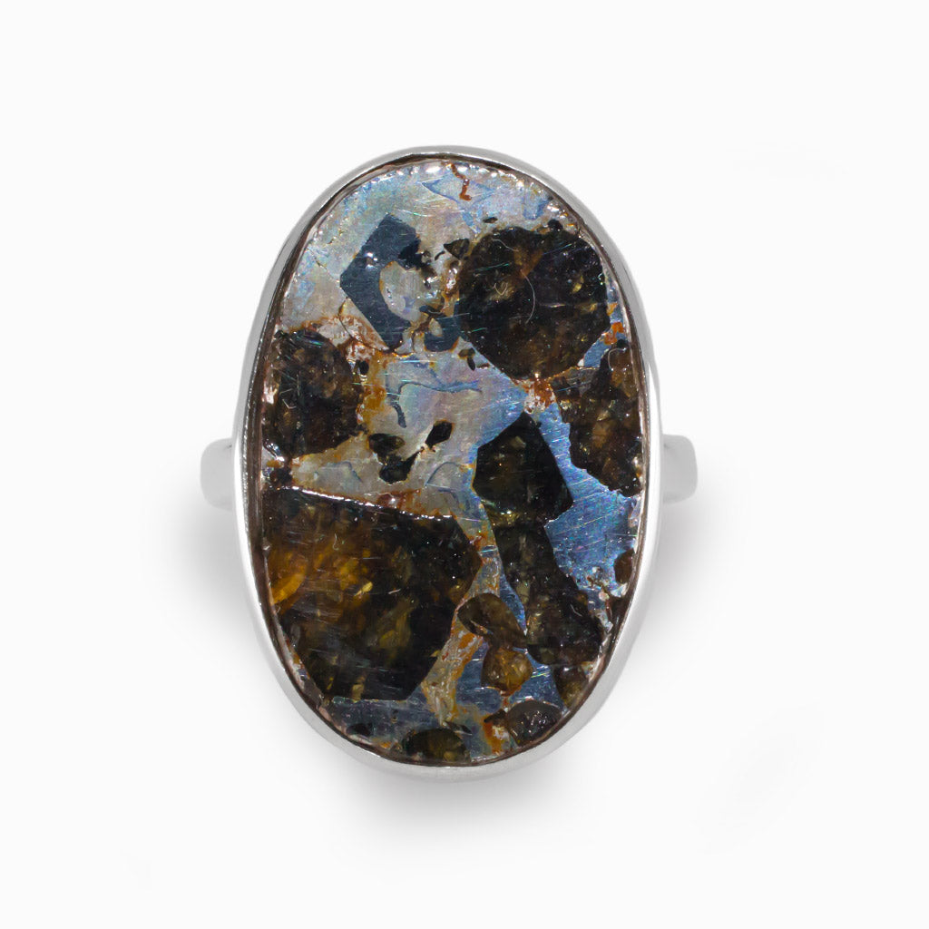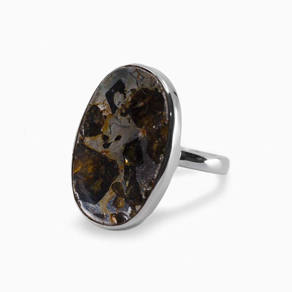This uncommon iron meteorite stone, which is brimming with stunning Peridot crystals, offers a rare glimpse into the unknown. The yellow-green crystals contrast beautifully with the shiny silver, creating a wonderful combination that's ideal for when you're feeling a touch out of this world. A Pallasite Meteorite ring will enhance your communication and endurance while also assisting you in feeling at one with the cosmos.