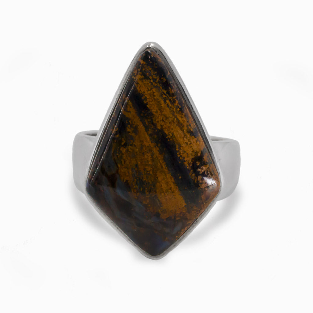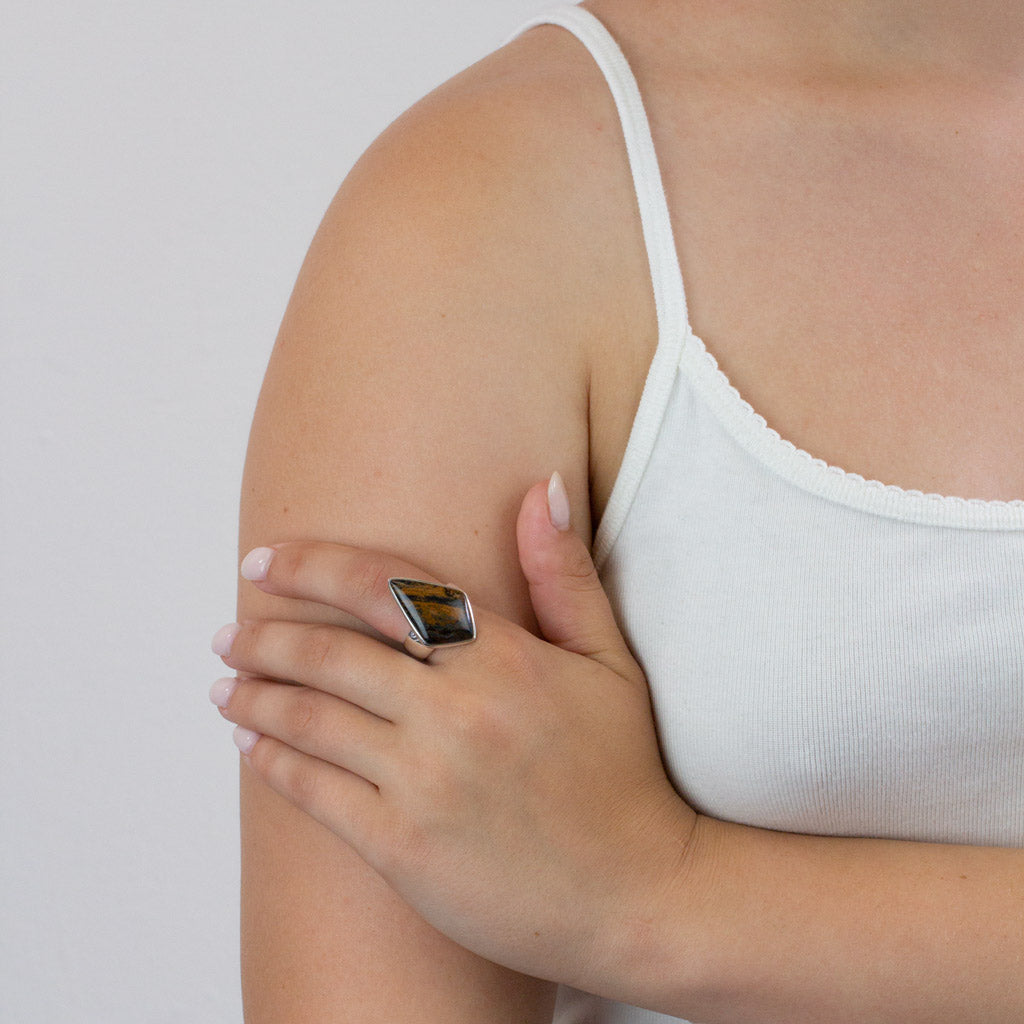 This Pietersite ring flaunts gold lightning with a slight velvety blue accent, much like the whirling patterns of a furious thunder-bound sky. This gorgeous cabochon gemstone ring in 925 sterling silver may be worn as a statement piece or combined with your favorite blue jeans. This Pietersite ring provides energy to its user that fosters self-loyalty and the ultimate experience of life, letting you look beyond the horizon and supporting courage and perseverance.