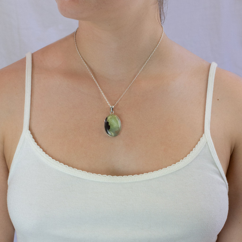 The vibrant and bold tones of this yellow-green and brown oval cabochon Prehnite necklace are citrus bliss! Not only is it the perfect addition to any spring or summer outfit but wearing this Prehnite stone necklace can enhance the protective fields that surround you. It will bring a calmness and an “inner” knowing when to prepare in advance for situations in life.