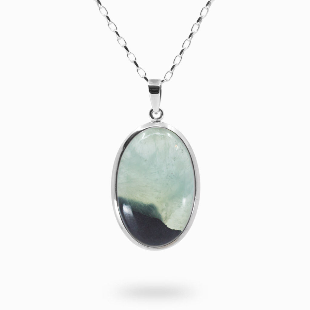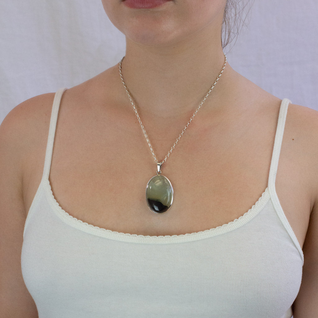 The vibrant and bold tones of this yellow-green oval cabochon Prehnite necklace are citrus bliss! Not only is it the perfect addition to any spring or summer outfit but wearing this Prehnite stone necklace can enhance the protective fields that surround you. It will bring a calmness and an “inner” knowing when to prepare in advance for situations in life.