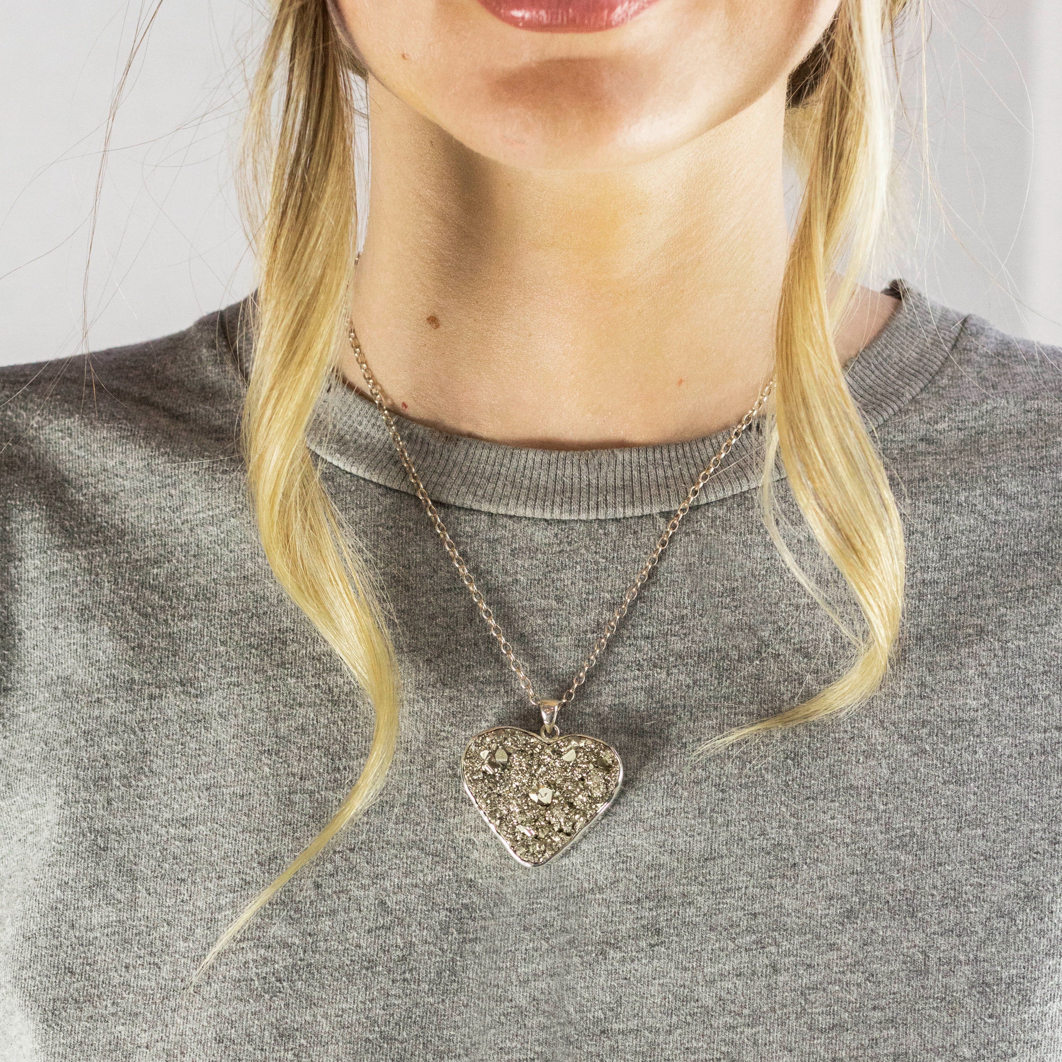 From boho-hippie to high-end stylish, this golden glittering Pyrite raw druzy heart necklace makes a lovely statement piece. This Pyrite cluster necklace is set in handcrafted 925 sterling silver and represents the sun's warmth. Allow this Pyrite necklace to enhance the recall of beautiful memories for you.