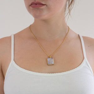 A dreamy white gemstone with a beautiful array of blue tones, this Rainbow Moonstone Necklace is adored from every angle. Known as the stone of new beginnings, Moonstone is also known as the traveler’s stone. Rainbow moonstone assists in carrying rainbows into one's life, bringing its wearer the white light of healing and the multi-colors activate each of the corresponding chakras.