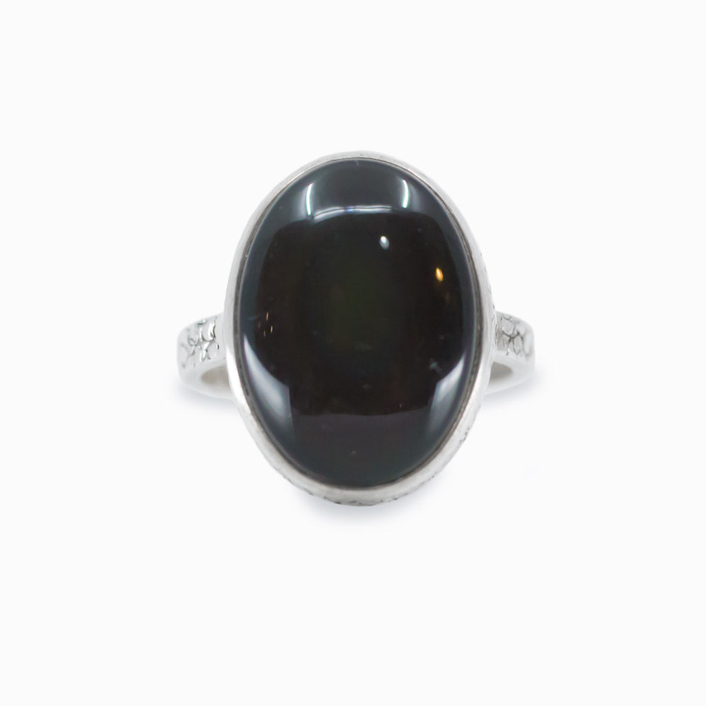 Natural volcanic glass with a rainbow of colors running through it. Rainbow Obsidian gemstone is a dream to wear and can be paired with absolutely any style. The colors work with everything. Not only will wearing this stone brings love and light to one's life but it is also a powerful protection stone! Depending on the colors within the stone correspond to those chakras being opened and activated. This Obsidian ring is also a “stone of pleasure” bringing gratification and enjoyment into one's life.