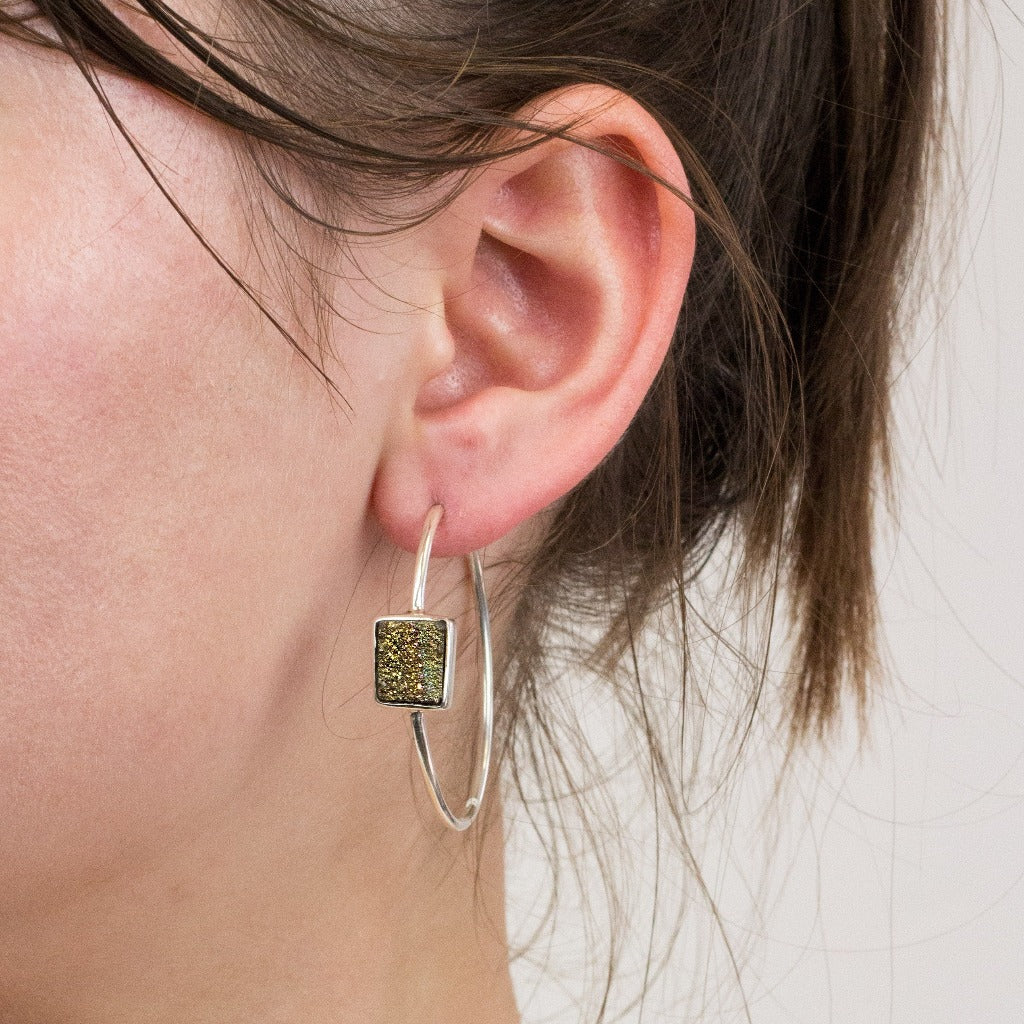 Rainbow flashes over textural, metallic pyrite crystals. This iridescent druzy stone is perfect to wear during a night out or simply let it sparkle all day in the sunlight. You don’t need to overthink your outfit… let the sparkling do the talking with these Rainbow Pyrite earrings. Wearing this gem will help to keep away all forms of negative vibrations, bringing protective energy that also improves memory and enhances positivity.