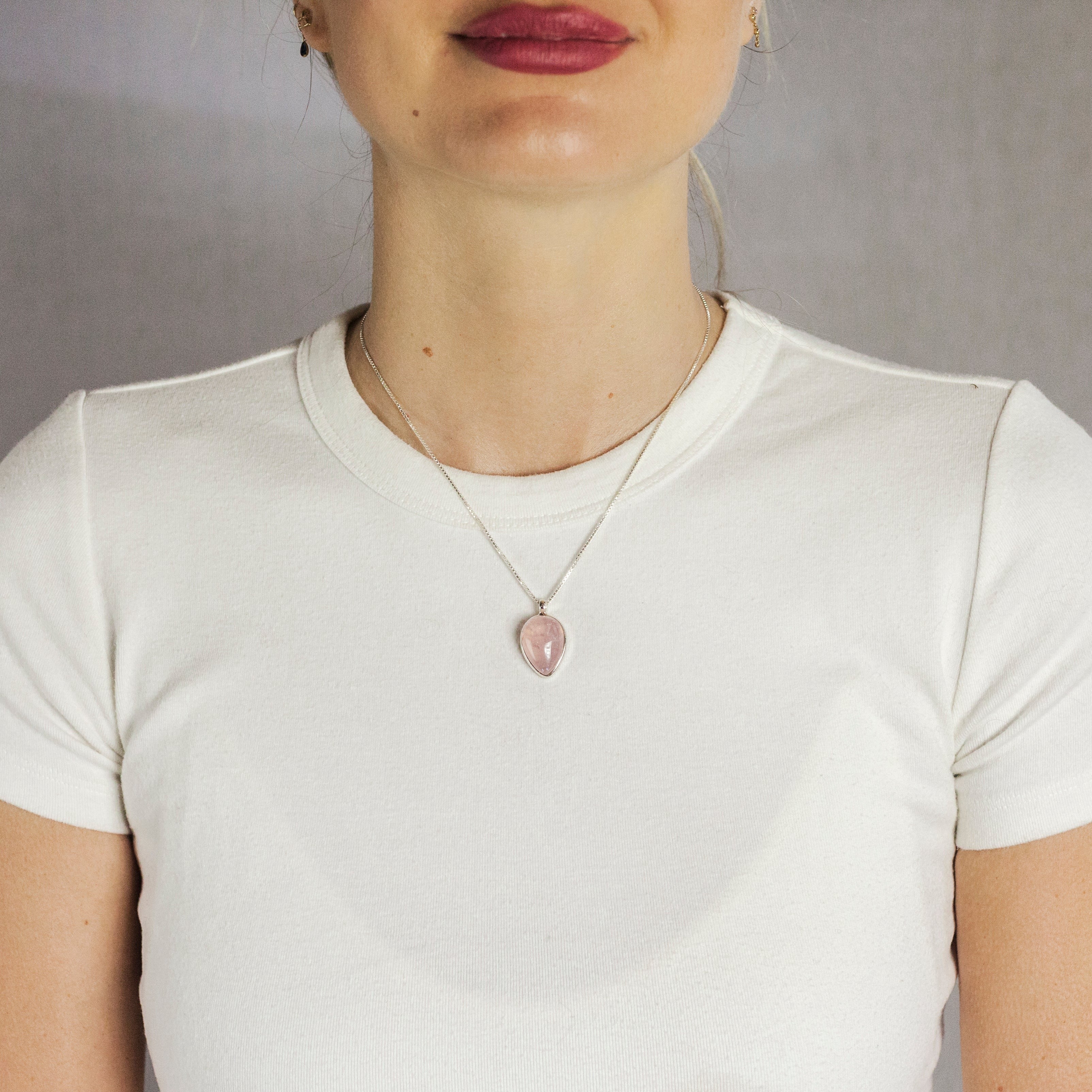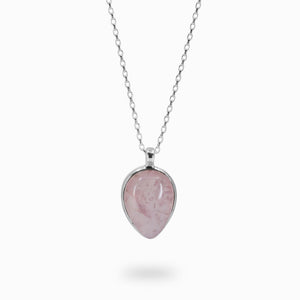 This soft cabochon tear-shaped Rose quartz crystal necklace adds a feminine touch to any style. This crystal necklace is a dream to wear being recognized as the “stone of gentle love”; let this beauty help you to bring peacefulness and calm to your life and relationships. It emits a calming and loving energy, removing negativity and reinforcing self-love.
