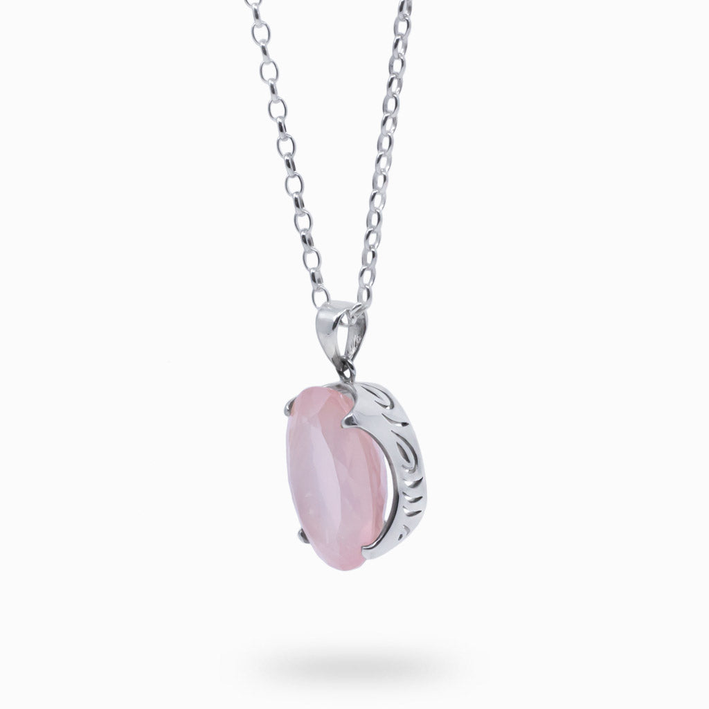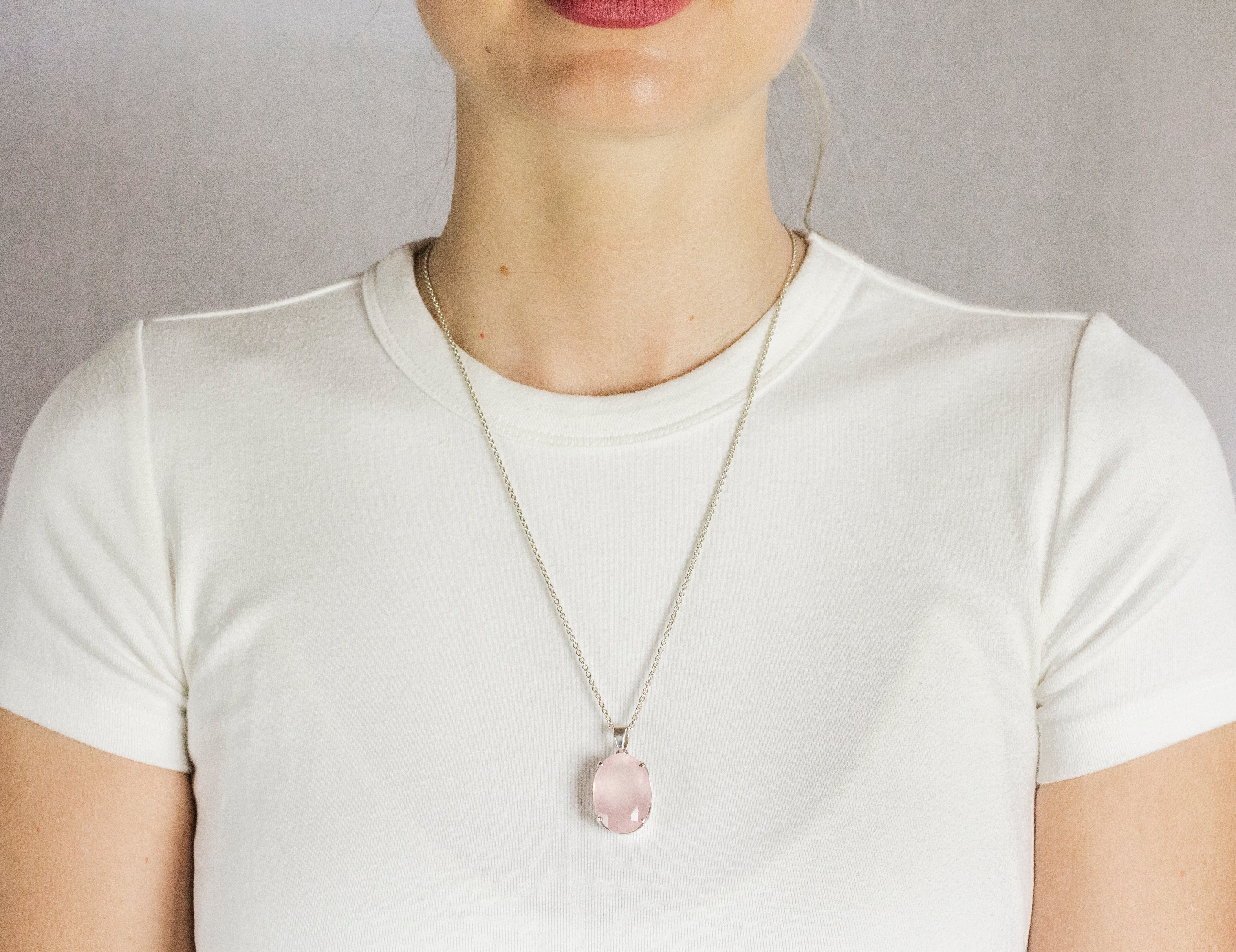 This faceted oval Rose Quartz crystal necklace is a dream to wear anytime, anywhere with its soft delicate pink hues. A “stone of gentle love” Rose quartz is used for spiritual attunement and healing emotional wounds. Can help fine-tune all the chakras.