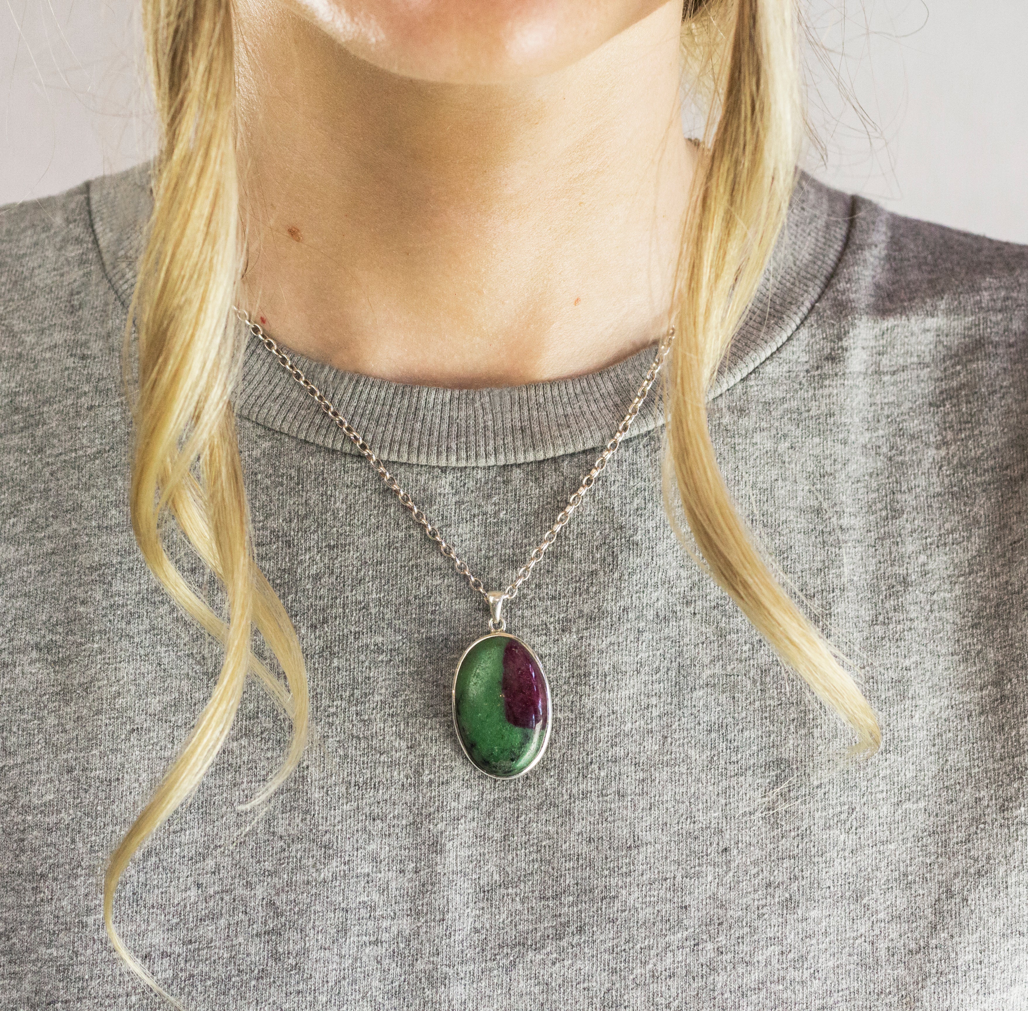 A lush combination of bold green Zoisite embedded with rich Ruby crystals shines bright with this exotic beauty. Simplicity is key when wearing this stone, for this bold Cabochon ruby and earthy zoisite necklace make a statement on their own. Its energy focuses on converting negative energy into positive, as well as encouraging compassion for others. It is known to increase the awareness of one's individuality, amplifies one's energy, and allow one to reach and utilize the talents and abilities of the mind.