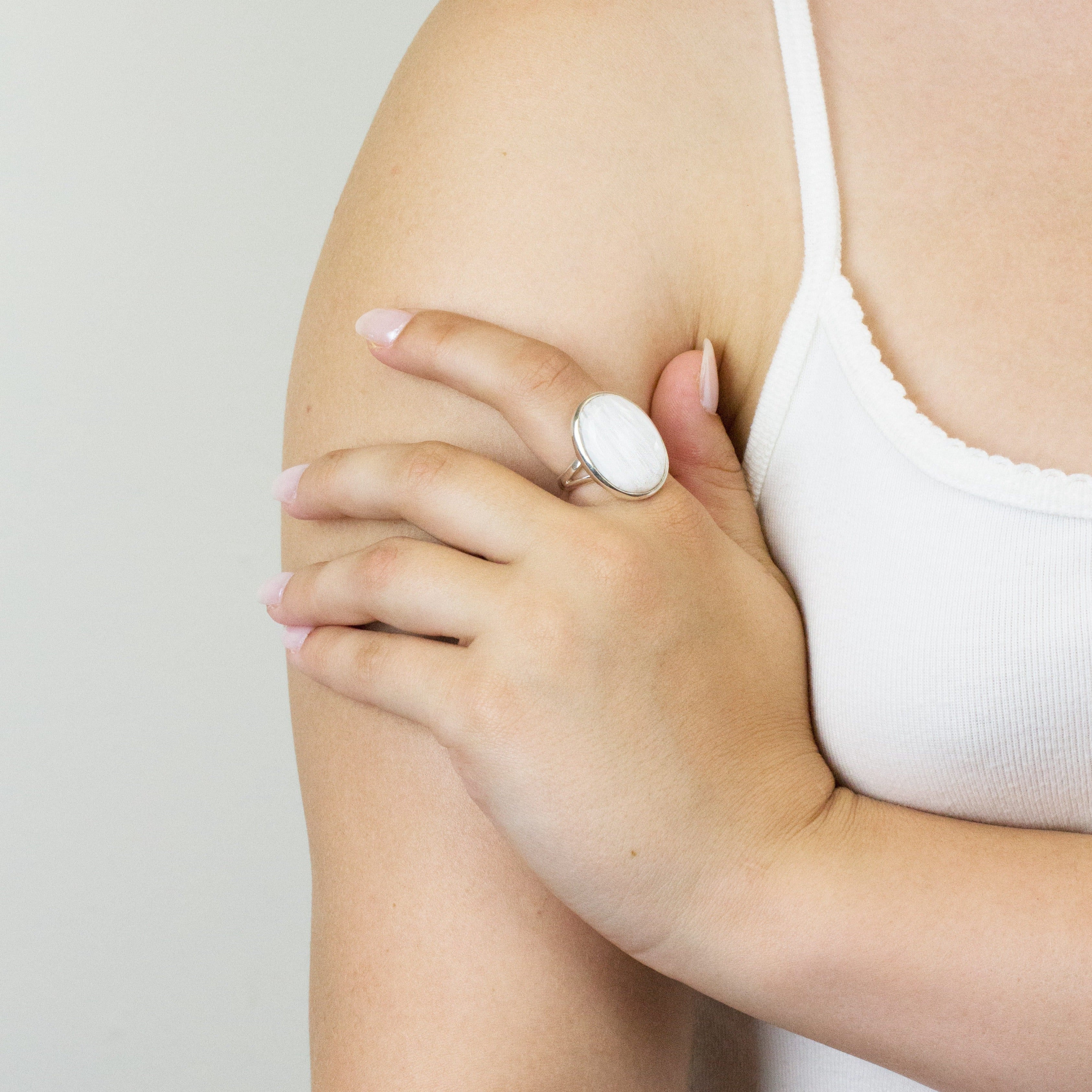 Pure white with fine-bladed inclusions, simple and complicated at the same time. Think of this Scolecite ring as a classic white t-shirt, it will be a go-to for your daily look. This stone can help you take control of your life and transform your heart to accept love.